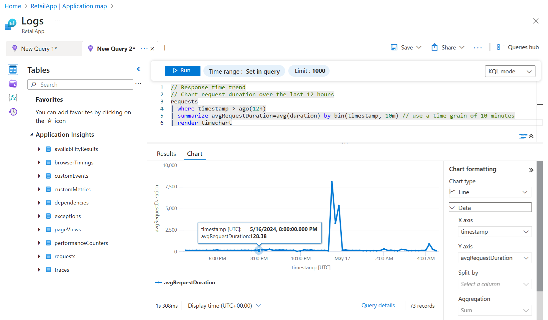 显示“日志”屏幕的屏幕截图,其中的折线图汇总了过去 12 小时内请求的平均响应持续时间。