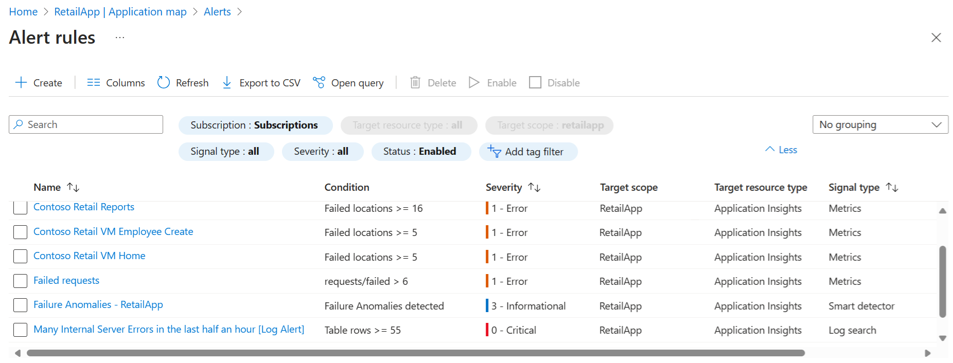 显示为所选组件定义的警报规则列表的屏幕截图。