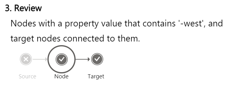 以下示例显示了节点筛选器的“查看”摘要,该筛选器搜索具有文本“-west”的属性的节点和目标: