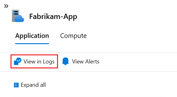 在节点详细信息窗格中,可以使用“在日志中查看(分析)”选项进一步查询和调查应用程序数据: