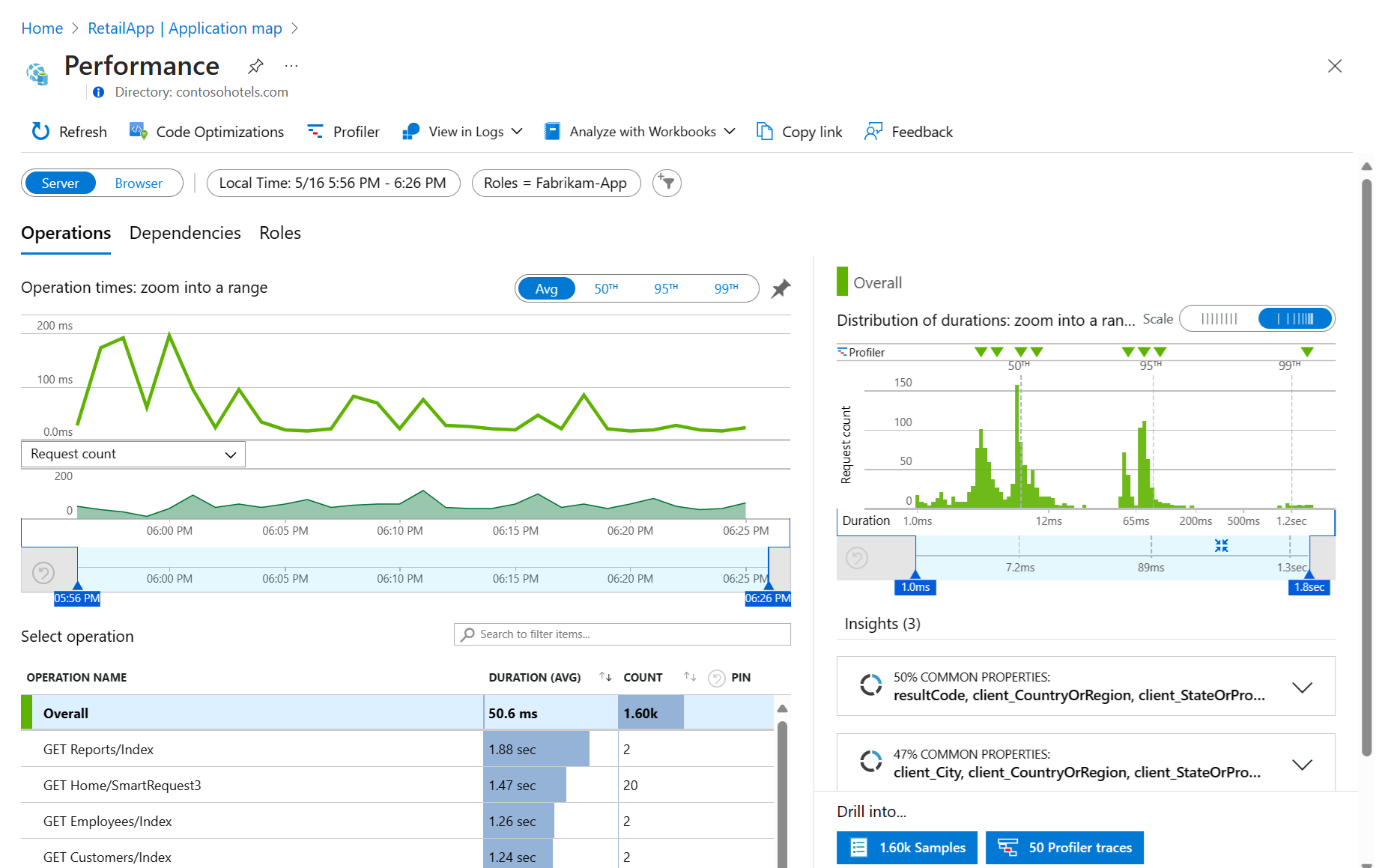通过“性能”视图,可以浏览与所选组件连接的操作、依赖项和角色的遥测数据: