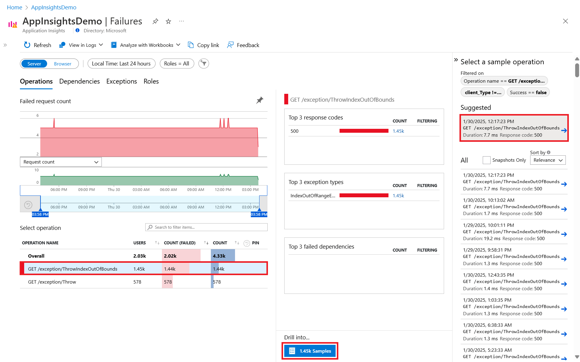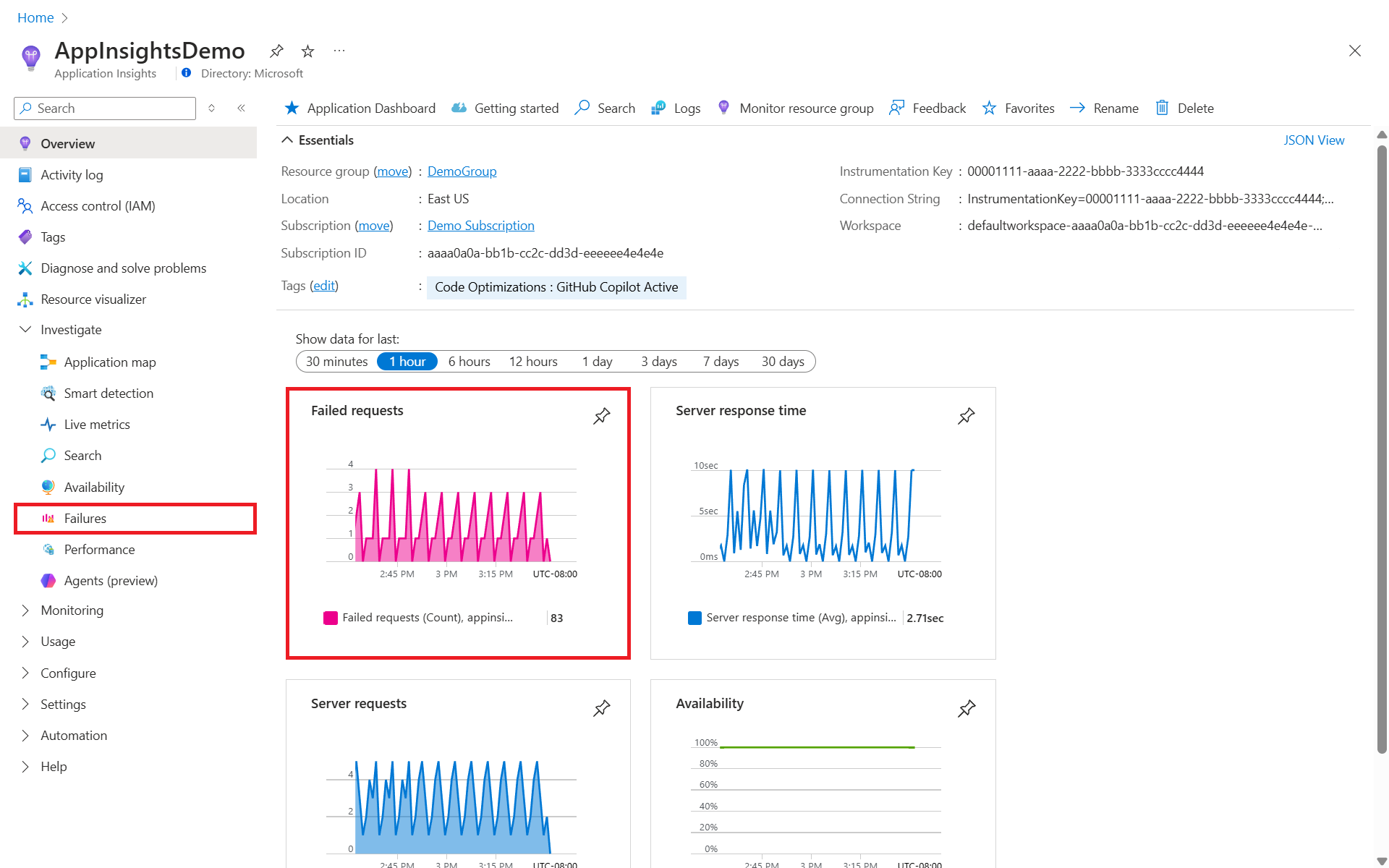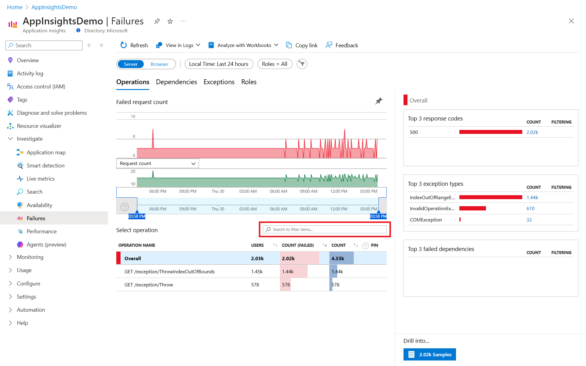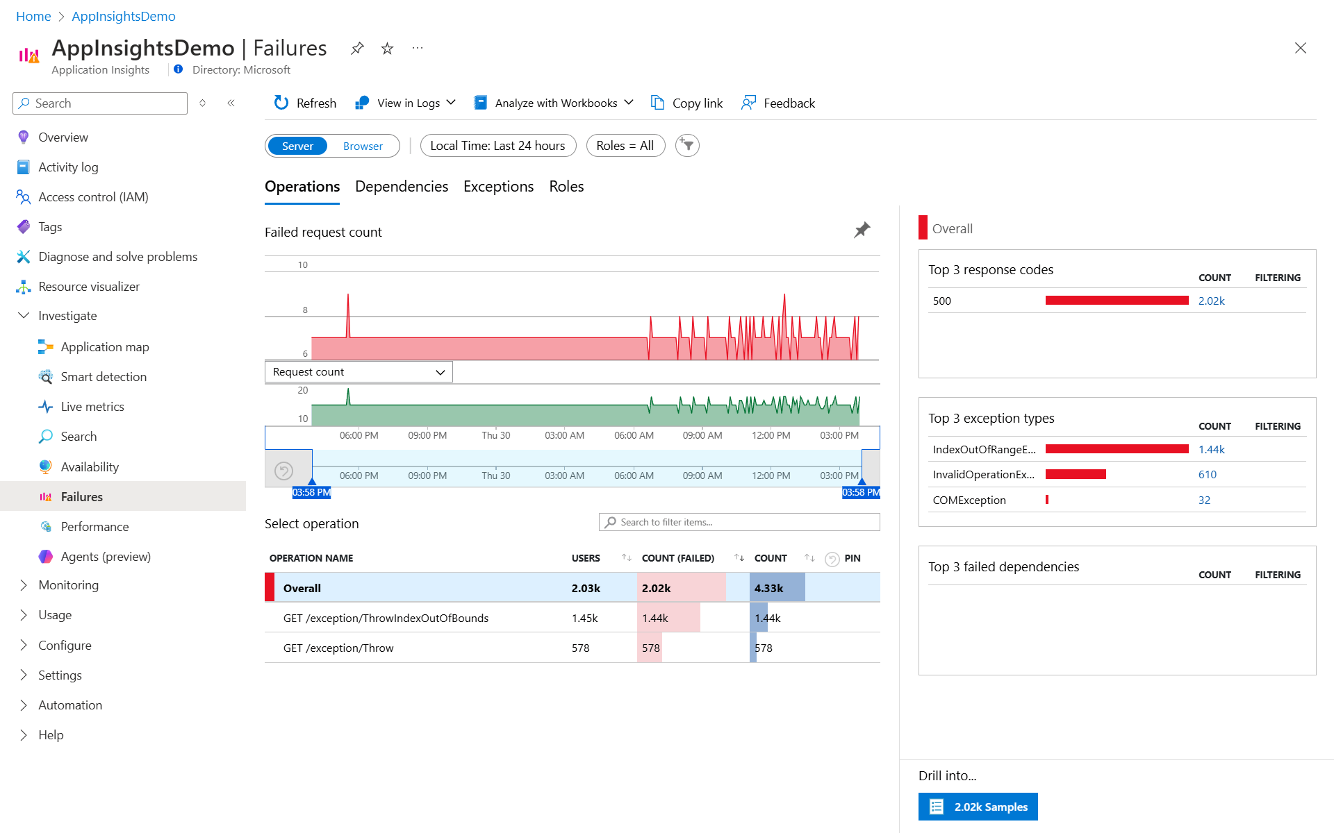 若要访问 Application Insights 中的“失败”视图,请在“概述”窗格上选择“失败的请求”图,或在资源菜单中的“调查”类别下选择“失败”。