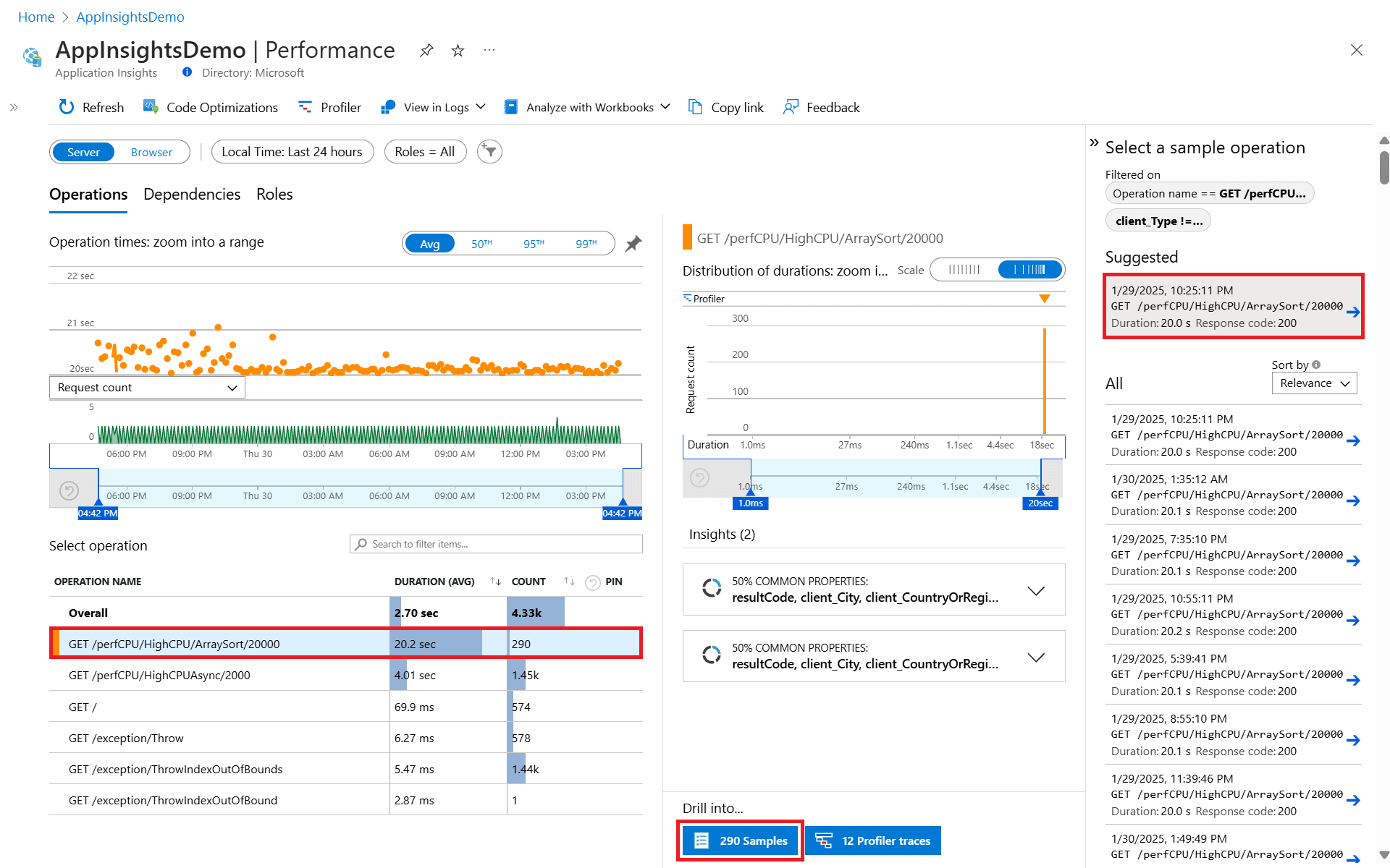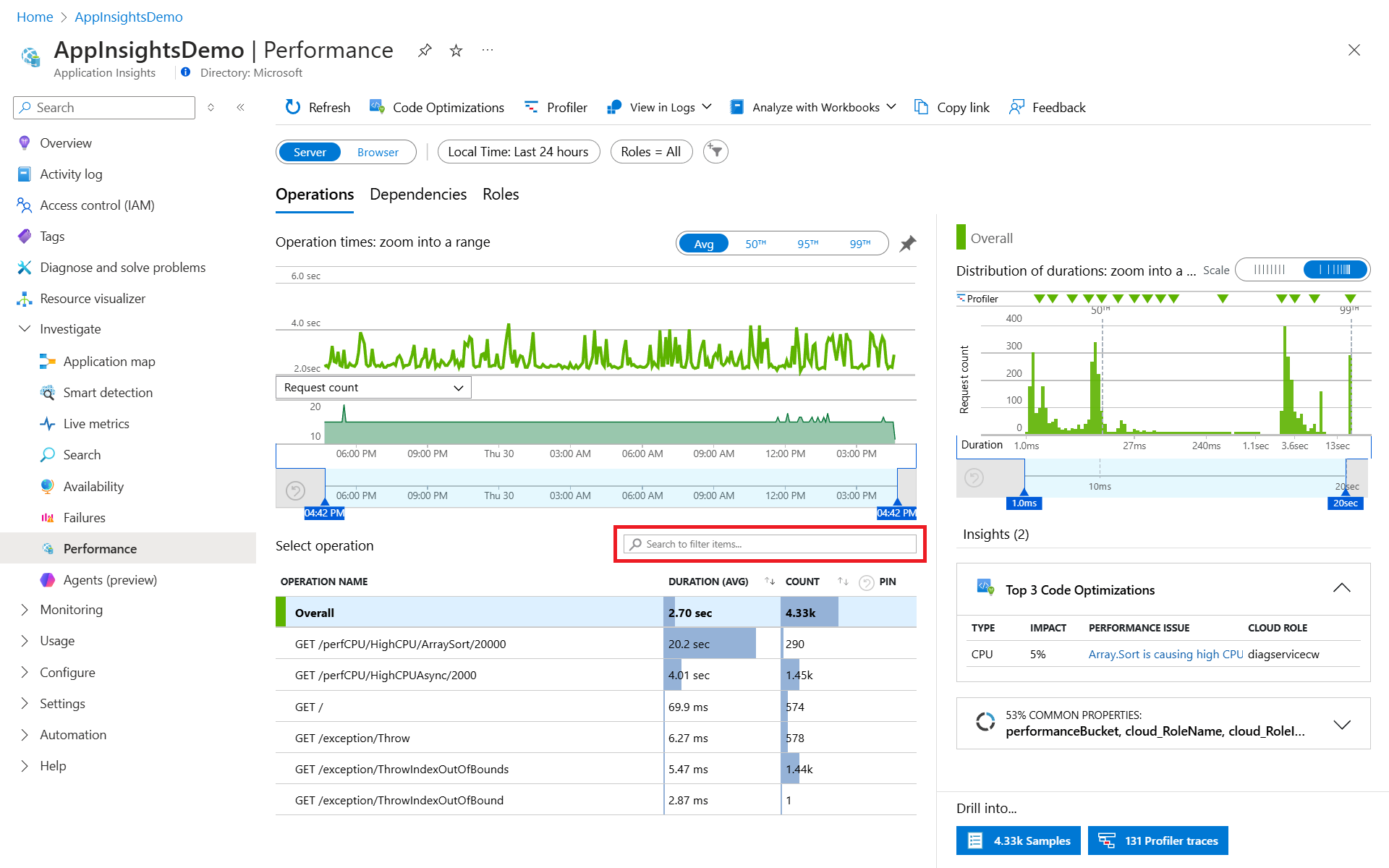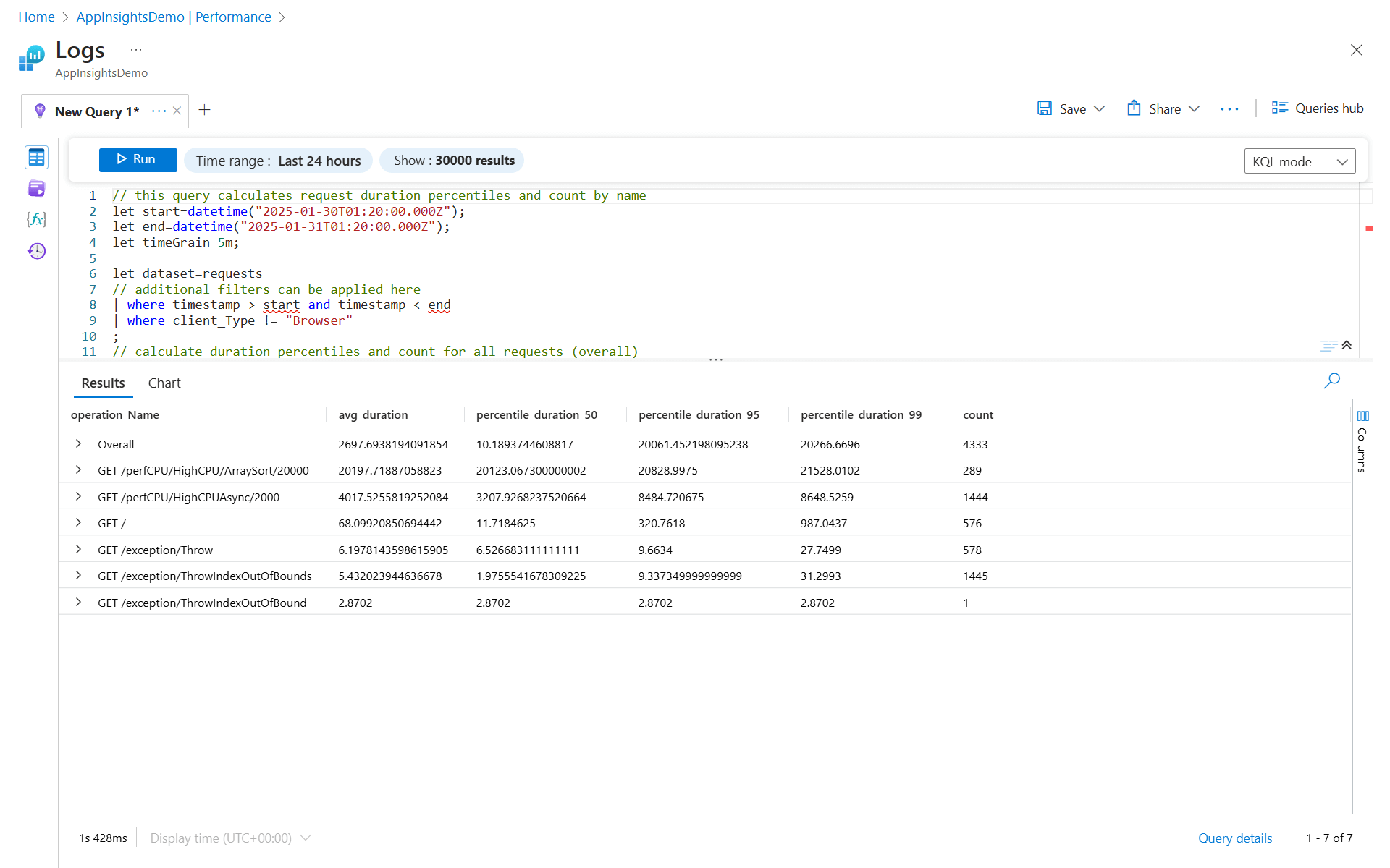 Application Insights 收集的所有数据都存储在 Log Analytics 中。 它提供丰富的查询语言,用于分析生成正在调查的异常的请求。