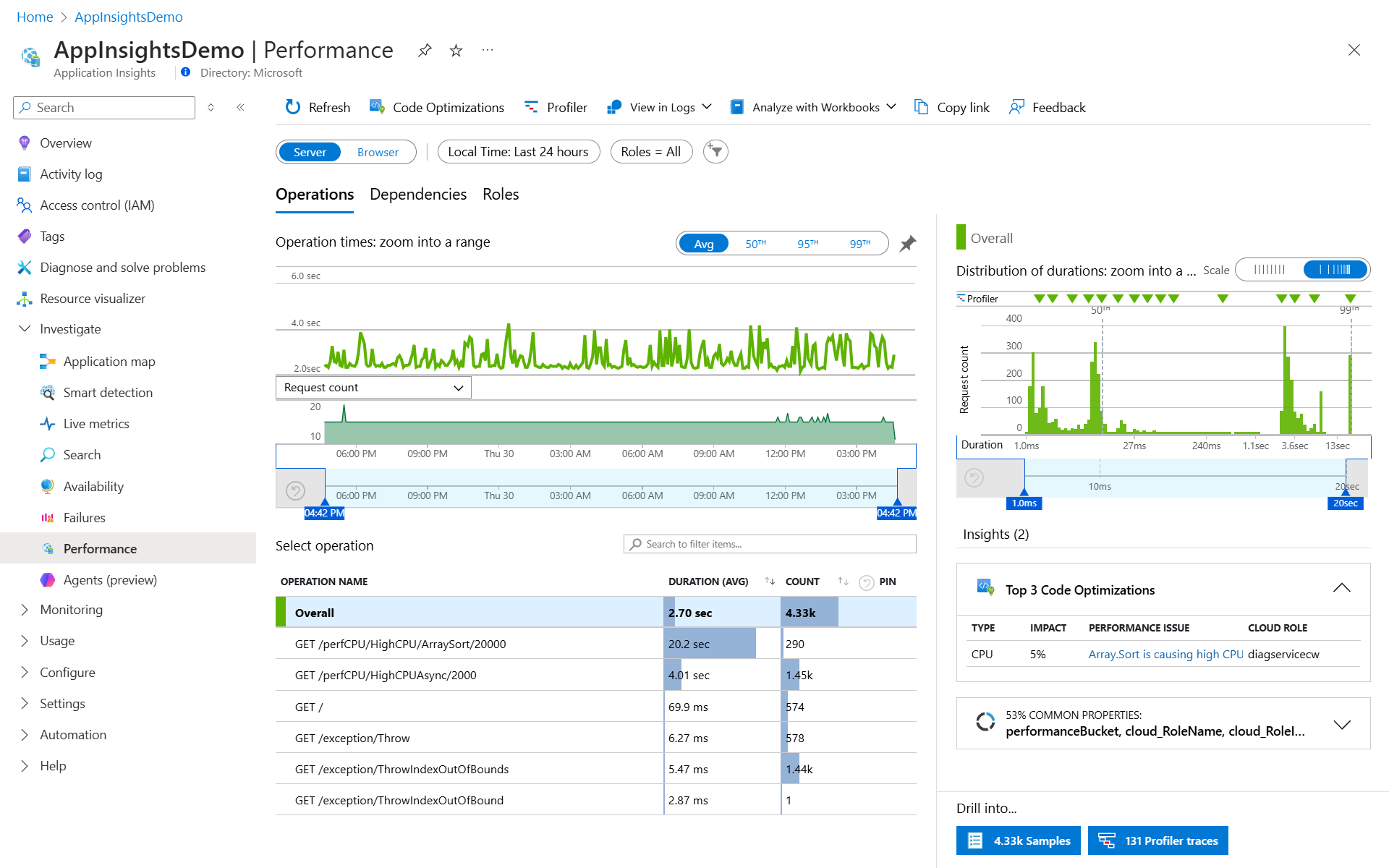 此诊断体验会自动将所有 Application Insights 监视组件中的服务器端遥测数据关联到单个视图中,并支持多个资源。 Application Insights 可检测基础关系,并可用于轻松诊断导致事务缓慢或失败的应用程序组件、依赖项或异常。