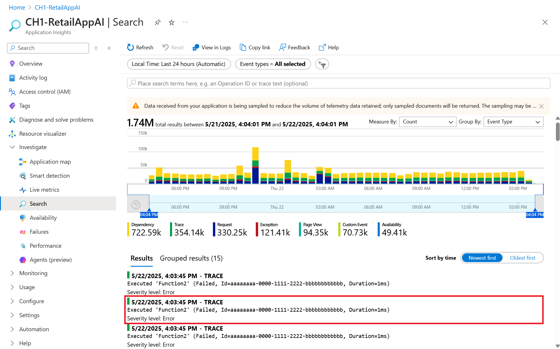 搜索视图 - 允许用户查找和检查各个遥测项,例如页面视图、异常和自定义事件。
