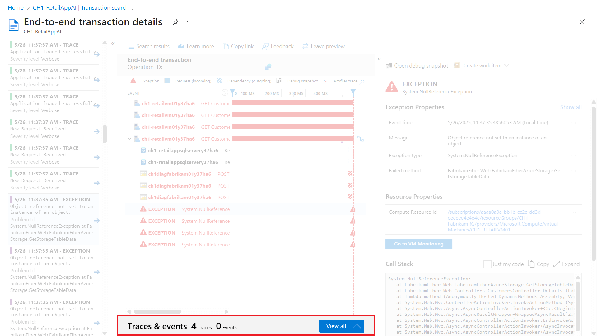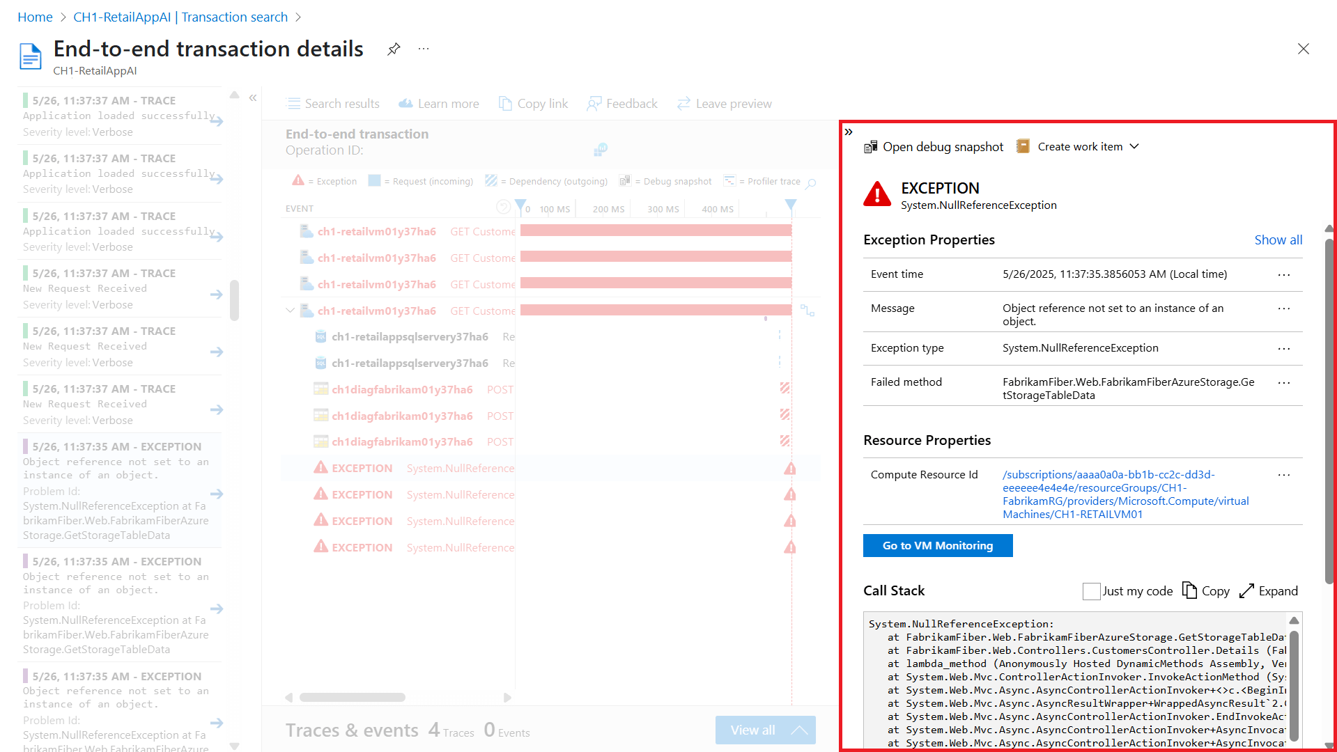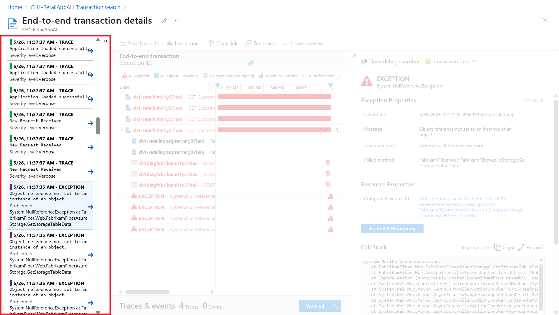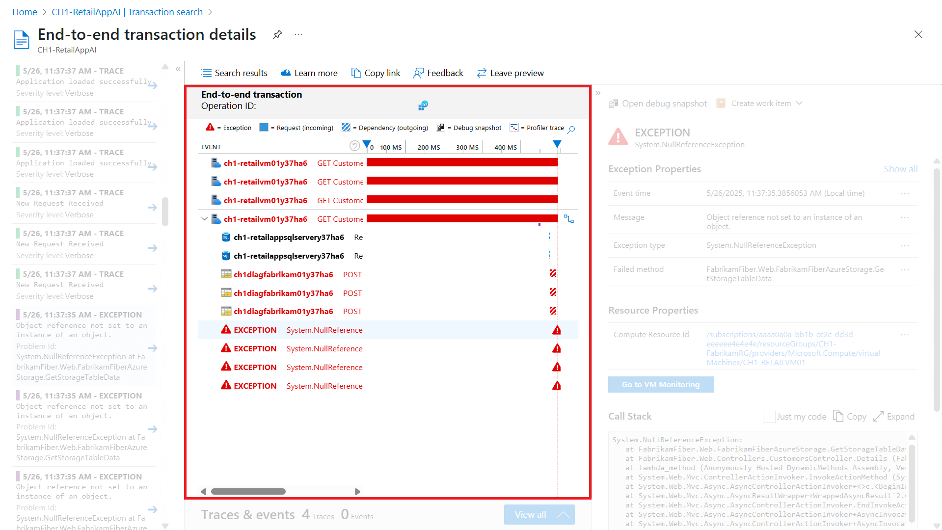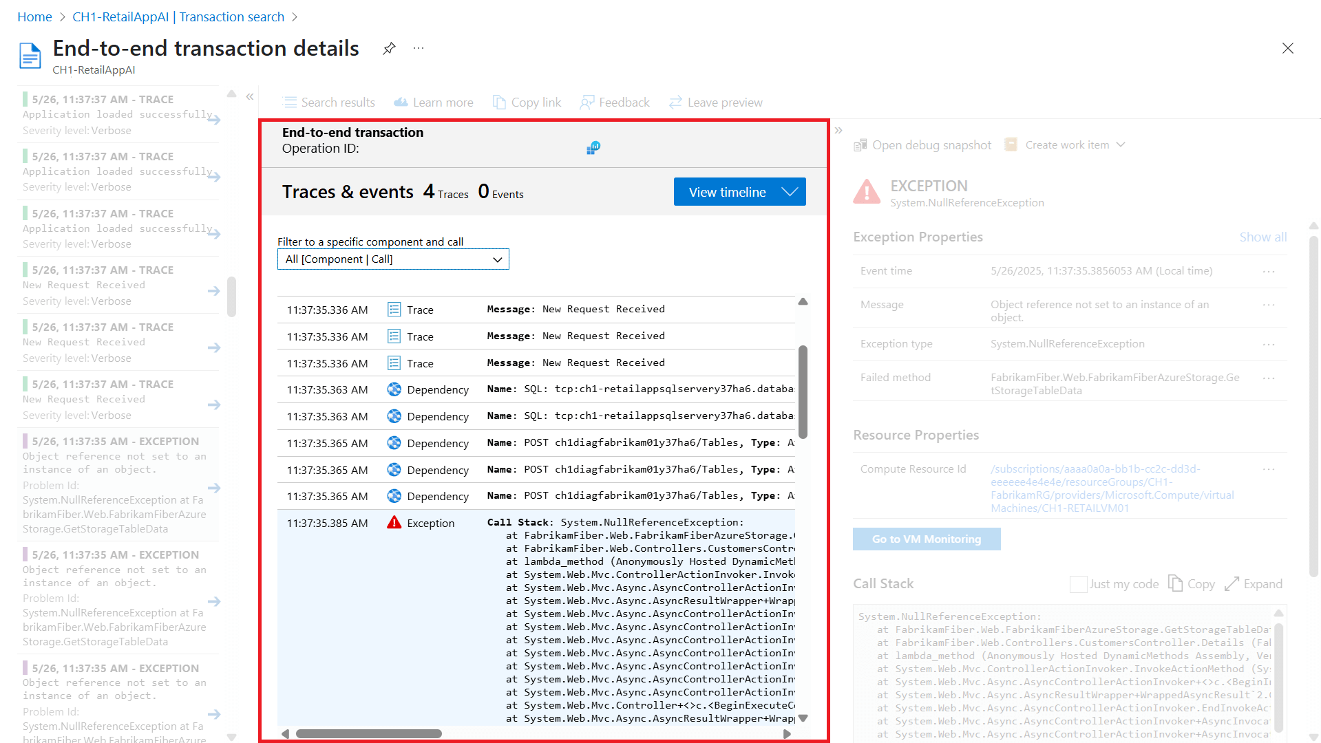 若要调查错误或异常的根本原因,可以深入分析问题操作,以获取包含依赖项和异常详细信息的详细端到端事务视图。