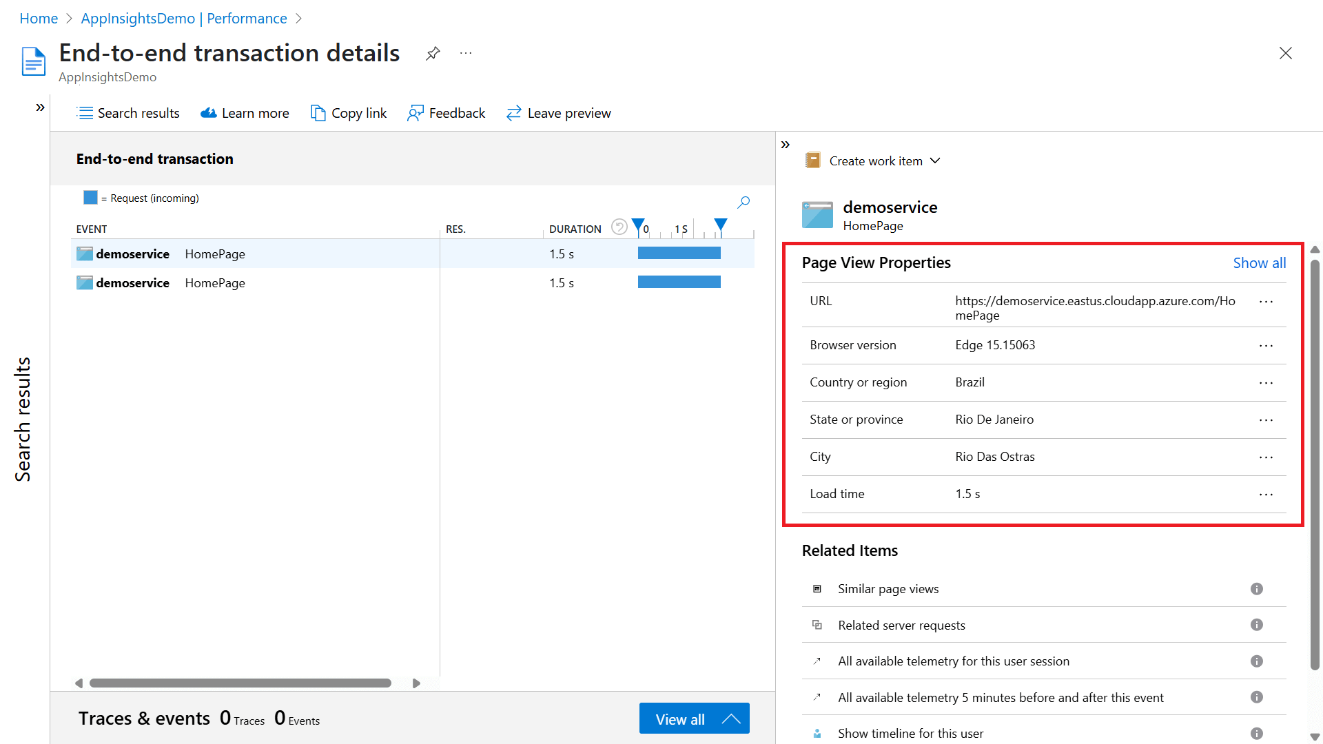 此行为是设计造成的。 所有组件中的所有相关项都已在左侧顶部和底部部分中提供。 在新的体验中,有两个左侧没有覆盖的相关项目:事件发生前后五分钟内的所有遥测数据以及用户活动时间线。