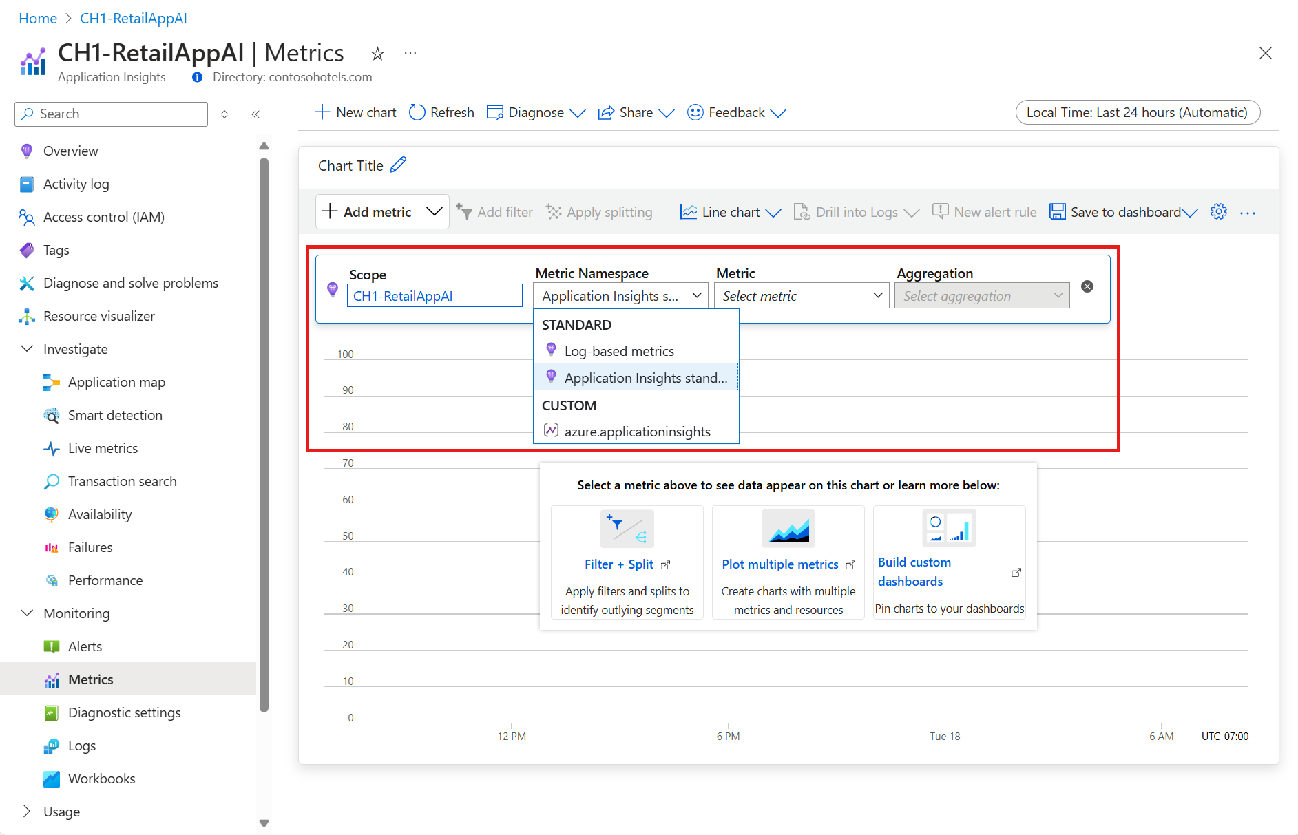 使用 Azure Monitor 指标资源管理器绘制预聚合、基于日志和自定义指标的图表,以及使用图表创作仪表板。 选择所需的 Application Insights 资源后,请使用命名空间选取器在指标之间进行切换。