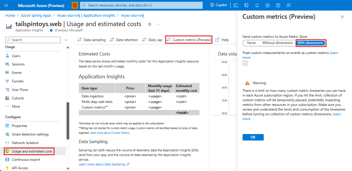 默认情况下,Application Insights 关闭自定义指标维度的集合。 使用维度存储自定义指标会产生与 Application Insights 不同的计费。 存储非二维自定义指标将保持免费状态,最高可达到配额。 有关详细信息,请参阅 Azure Monitor 定价页。