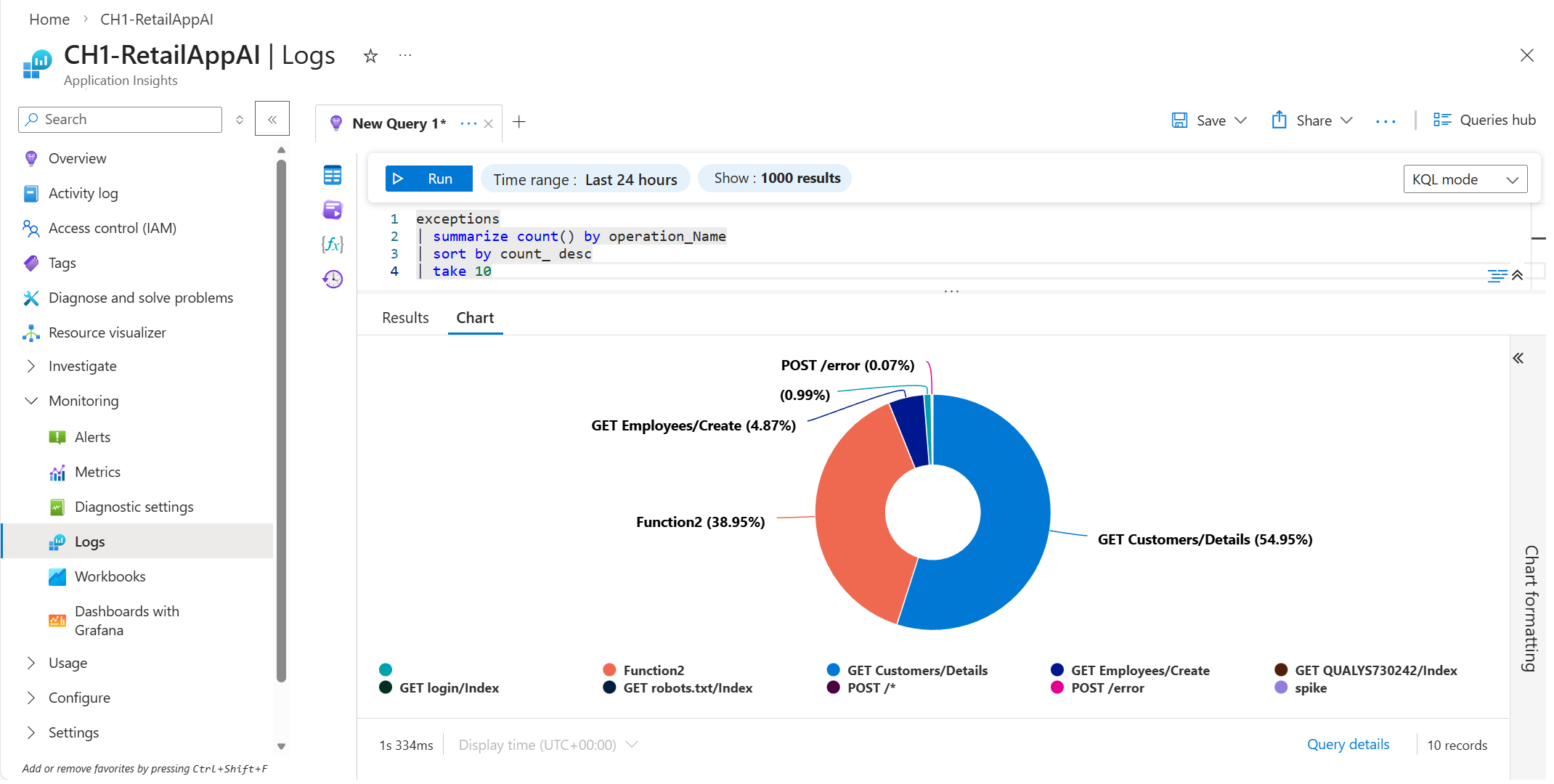 6. 在返回仪表板之前,请添加其他查询,但将其呈现为图表。 现在你可以看到在仪表板中直观显示日志查询的不同方法。 从以下查询开始,该查询总结了前 10 个最常出现异常的操作: