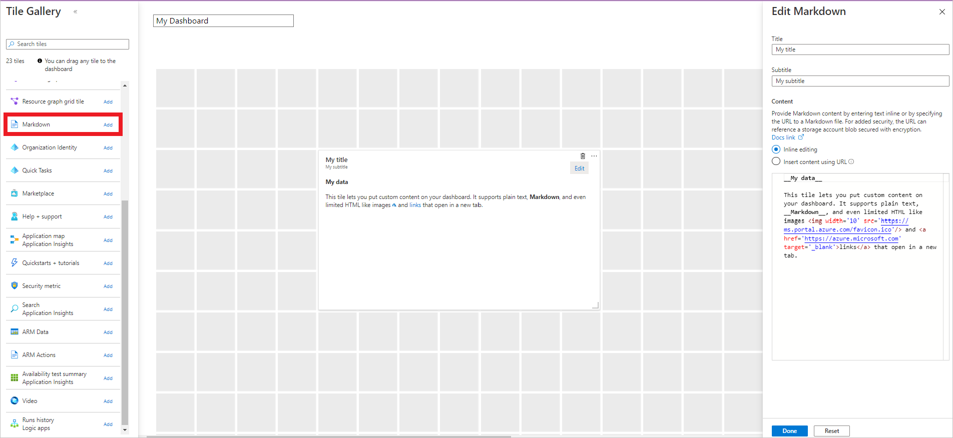 5. 找到“Markdown”磁贴,并将其拖动到仪表板中。 使用该磁贴,你可以添加 Markdown 格式的文本,这对于向仪表板添加说明性文本而言是理想选择。 若要了解详细信息,请参阅在 Azure 仪表板上使用 Markdown 磁贴显示自定义内容