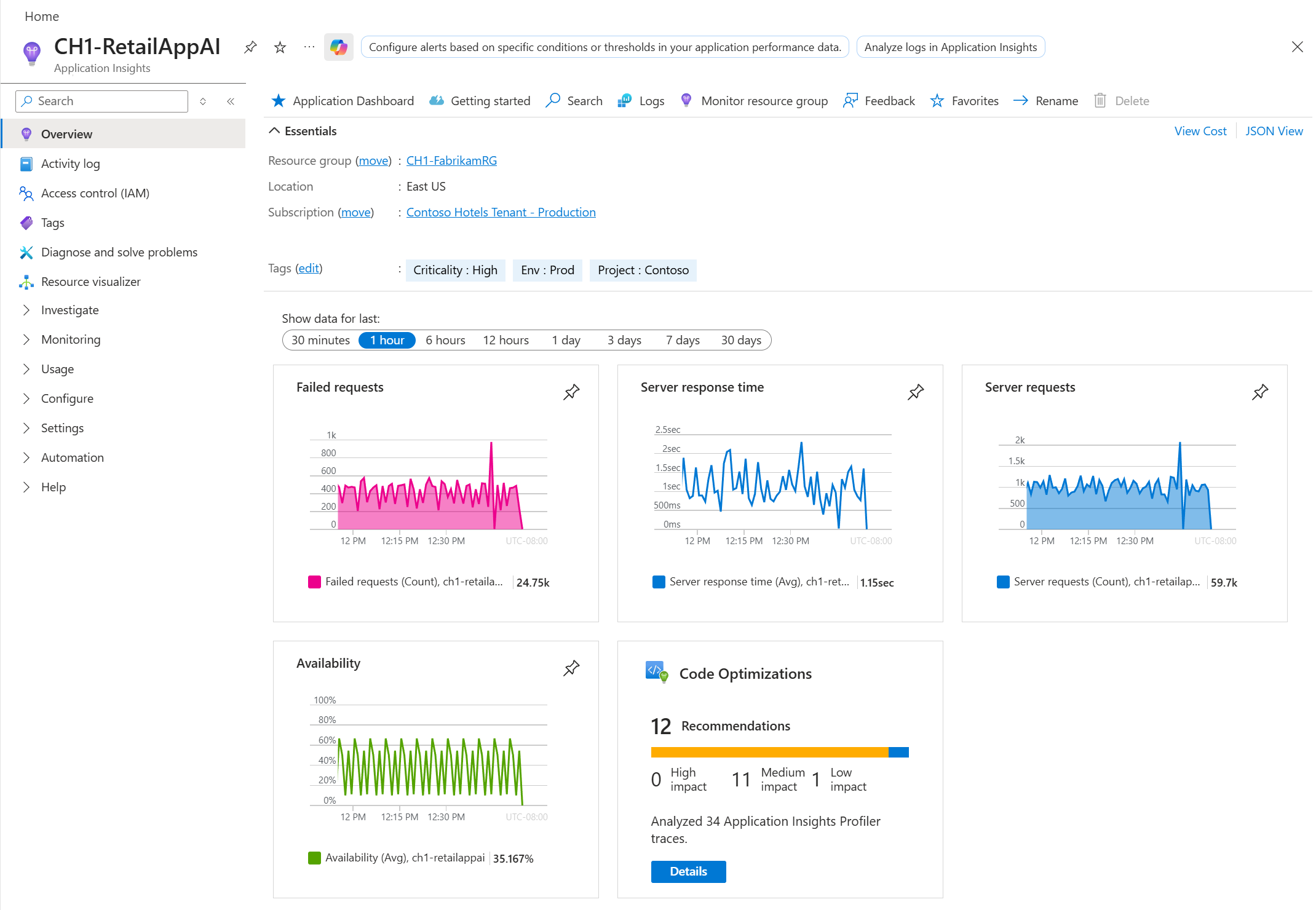 Application Insights 有一个总览窗格,可让用户直接地评估应用程序的健康状况和性能。