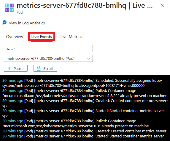 若要在 Log Analytics 工作区中查看数据,请选择“在 Log analytics 中查看活动”。 日志搜索结果可能会显示“节点”、“守护程序集”、“副本集”、“StatefulSet”、“作业”、“Cron 作业”、“Pod”和“容器”。 这些日志可能不再存在。