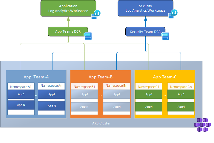 以下部分详细介绍了为每个应用程序或基础结构团队创建单独的 DCR 的不同方法。 每个命名空间将包括一组 K8s 命名空间和一个 Log Analytics 工作区目标。