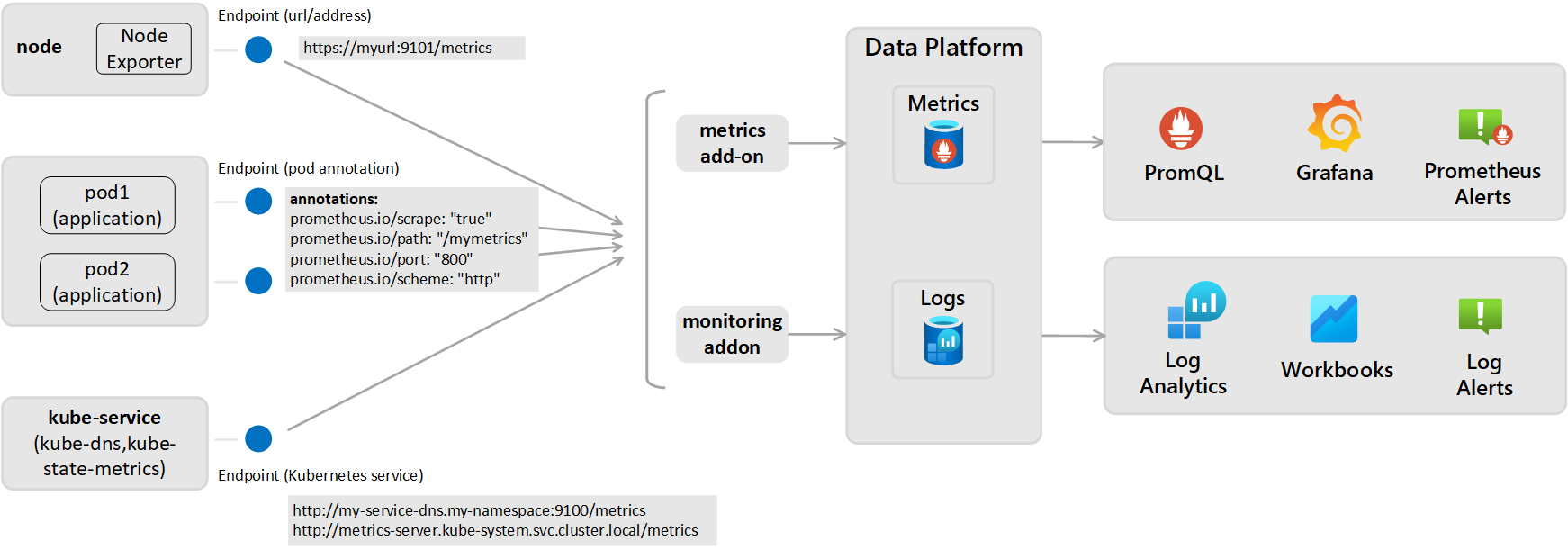 此配置要求为 Azure Monitor 代理配置监视加载项,这是容器见解用于将数据发送到 Log Analytics 工作区的加载项。 这要求通过导出程序或 Pod 公开 Prometheus 指标终结点,然后为容器见解使用的 Azure Monitor 代理配置监视加载项,如下图所示。