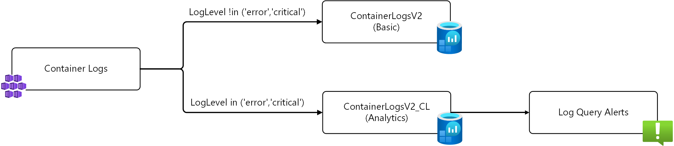 如果需要对容器日志进行近实时警报,摘要规则可能不够响应。 在操作敏感场景中,当需要准实时日志警报时,可使用 转换,将高价值日志(如错误和关键事件)路由到 Analytics Logs 表,同时将其他日志发送到 Basic Logs 或 Auxiliary Logs 表中。 使用此策略,可以在分析层中的表上执行高级警报,同时将其他数据路由到成本较低的层,实现经济高效的存储和偶尔分析。