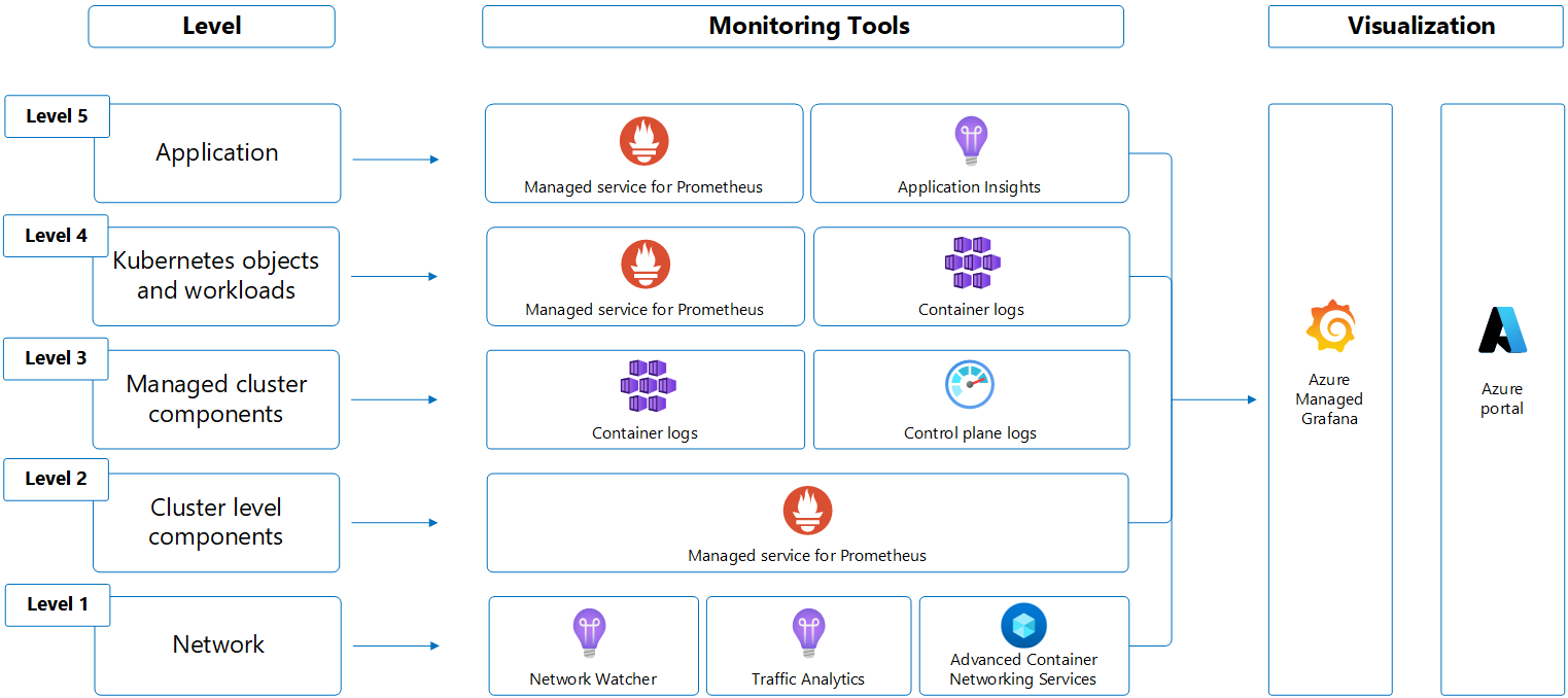 下面是从基础结构层到应用程序的典型 Kubernetes 环境的插图。 每个层都有不同的监视要求,这些要求由下面所述的不同 Azure 服务解决。