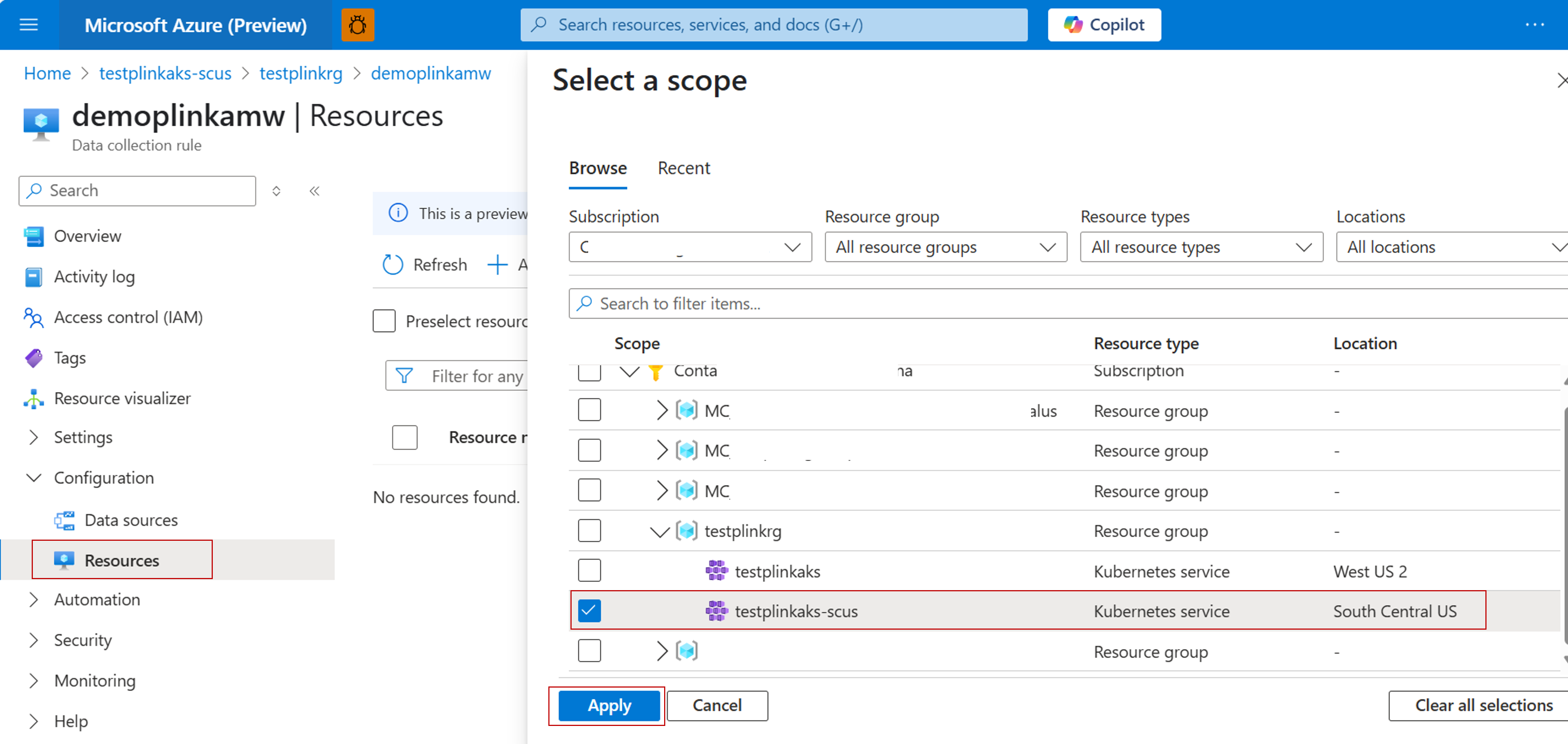 在 DCR 概述页中,单击“ 资源 ”->+“添加”,然后选择 AKS 群集。