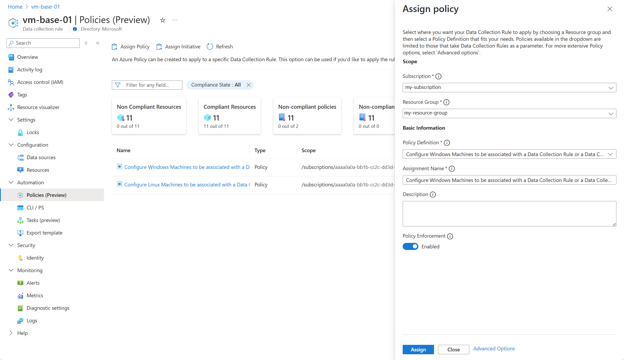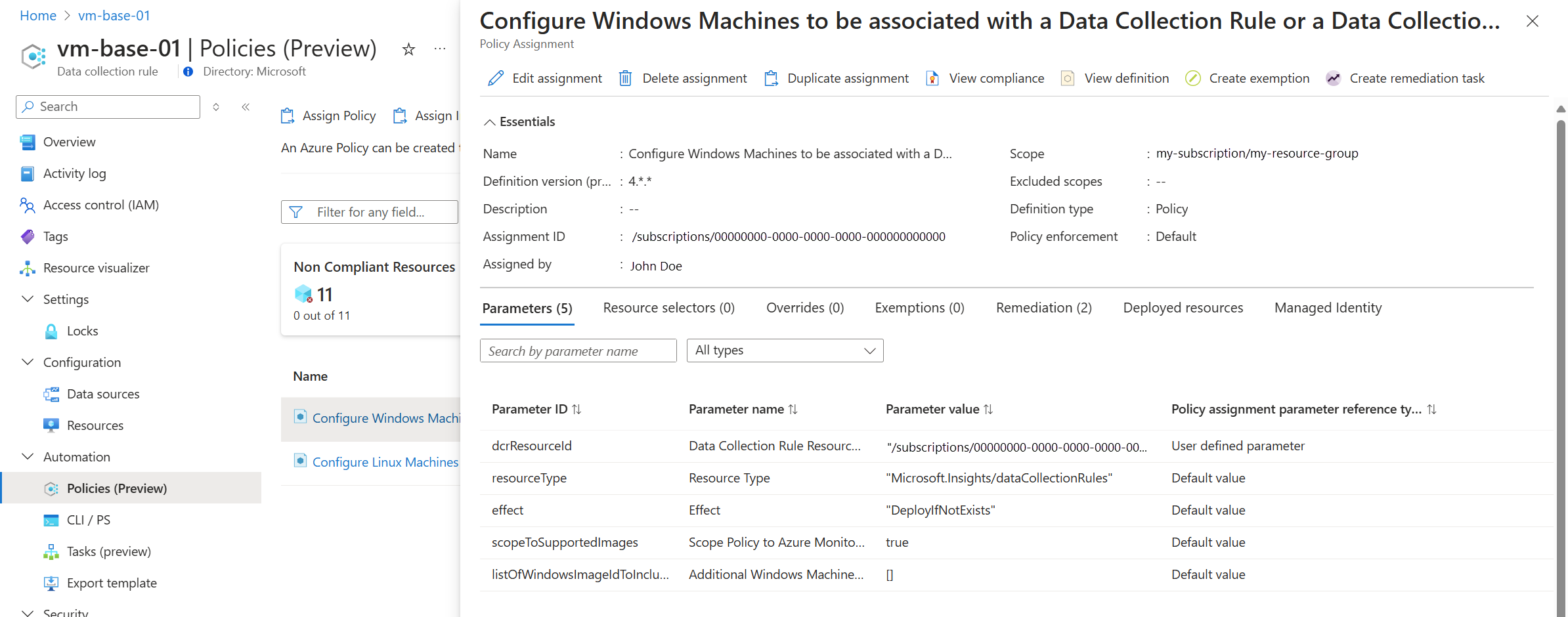 Azure Policy 中的策略是指 Azure 中的资源必须遵守的单个规则或条件。 例如,有一个名为 “配置 Windows 计算机以与数据收集规则或数据收集终结点相关联”的内置策略。