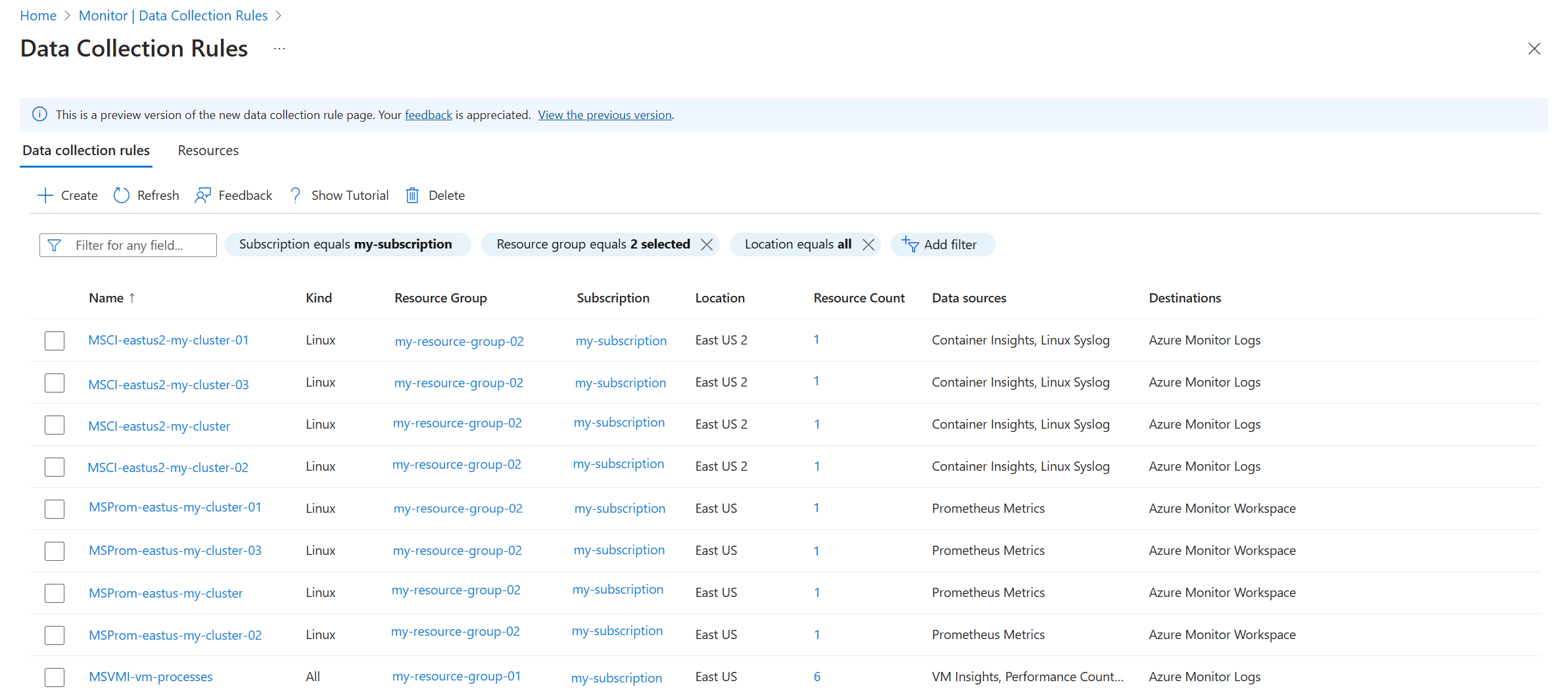 尽管此视图显示指定订阅中的所有 DCR,但选择“ 创建 ”按钮会为 Azure Monitor 代理创建数据收集。 同样,此页面仅允许修改 Azure Monitor 代理的 DCR。 有关如何为其他工作流创建和更新 DCR 的指南,请参阅在 Azure Monitor 中创建和修改数据收集规则。