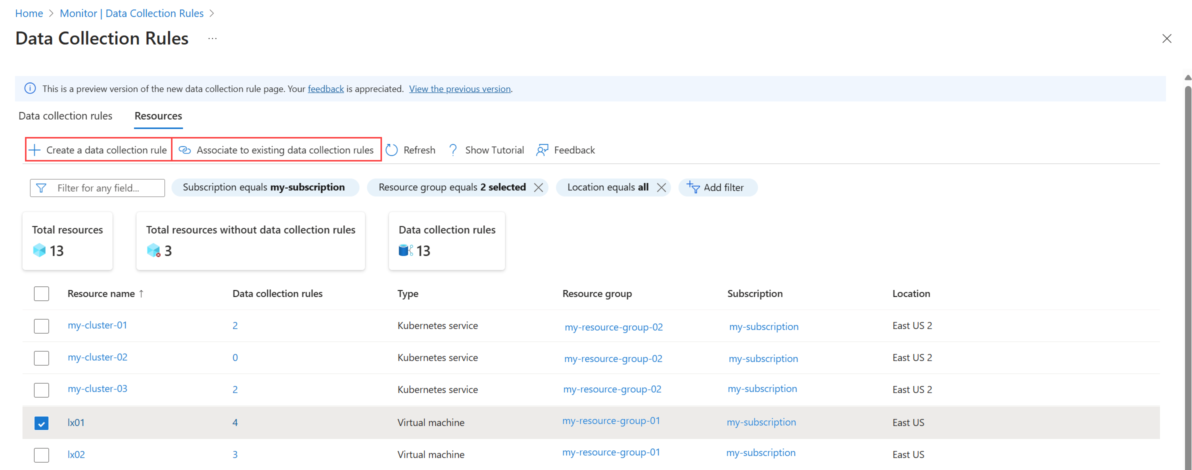 使用“资源”视图,可为选定资源创建新的 DCR,或将其与现有 DCR 相关联。 选择资源,然后单击以下选项之一。