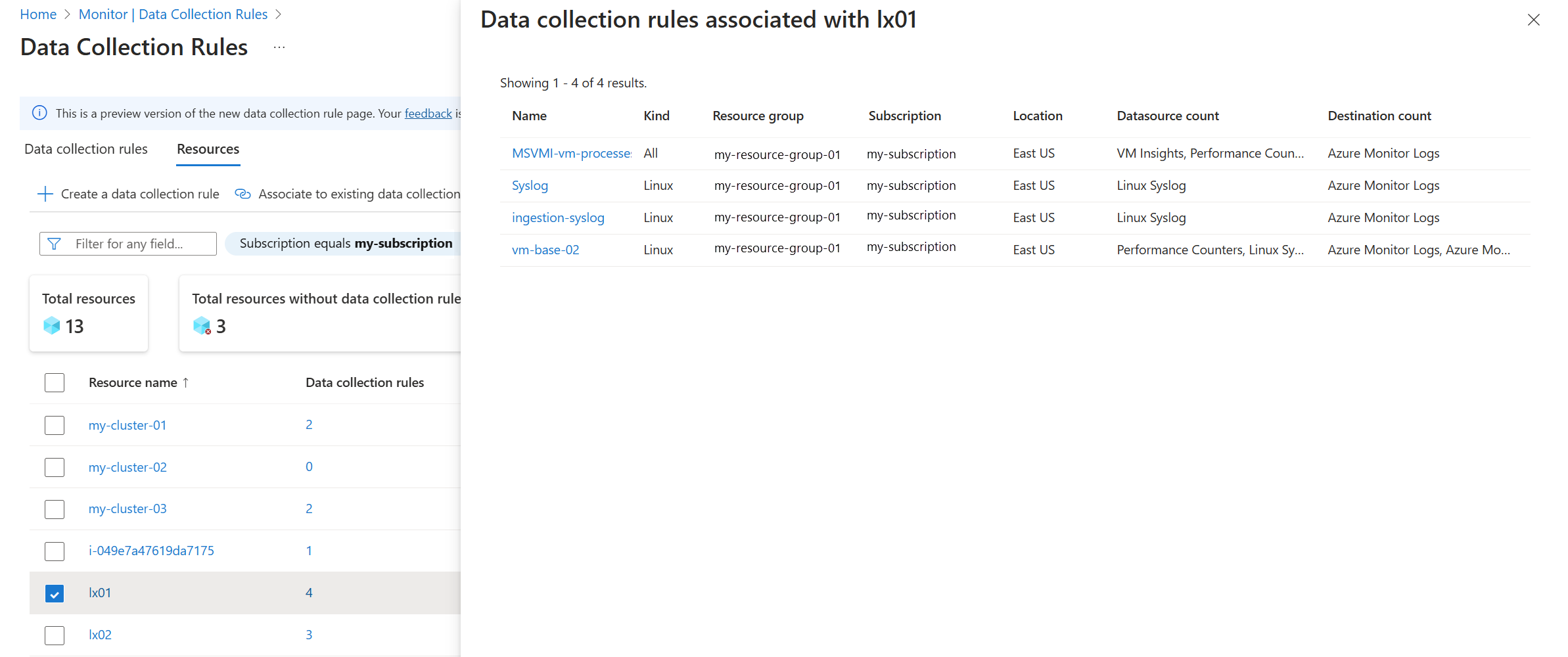 “数据收集规则”列表示与每个资源关联的 DCR 数。 单击此值可打开一个新窗格,其中列出了与资源关联的 DCR。