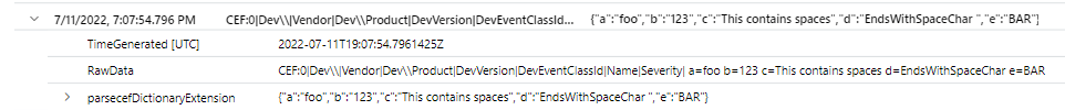 | project TimeGenerated, cefMessage, parsecefDictionaryExtension