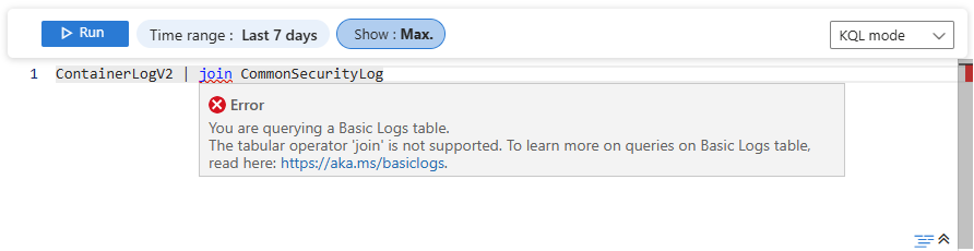 支持使用所有 KQL 标量和聚合函数查询基本或辅助表中的数据。 但是,仅限对单个表进行基本或辅助表查询。 因此存在以下限制: