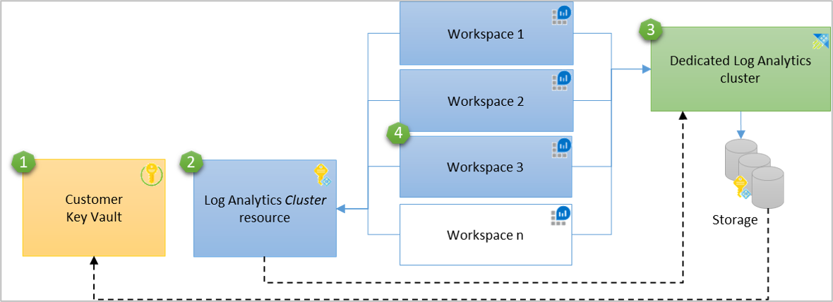 Azure Monitor 使用托管标识向 Azure Key Vault 中的密钥授予访问权限。 群集级别支持 Log Analytics 群集的身份功能。 若要在多个工作区上提供客户管理的密钥,Log Analytics专用群集资源充当Key Vault与Log Analytics工作区之间的中间标识连接。 群集的存储使用与群集关联的托管标识通过Microsoft Entra ID向Azure Key Vault进行身份验证。