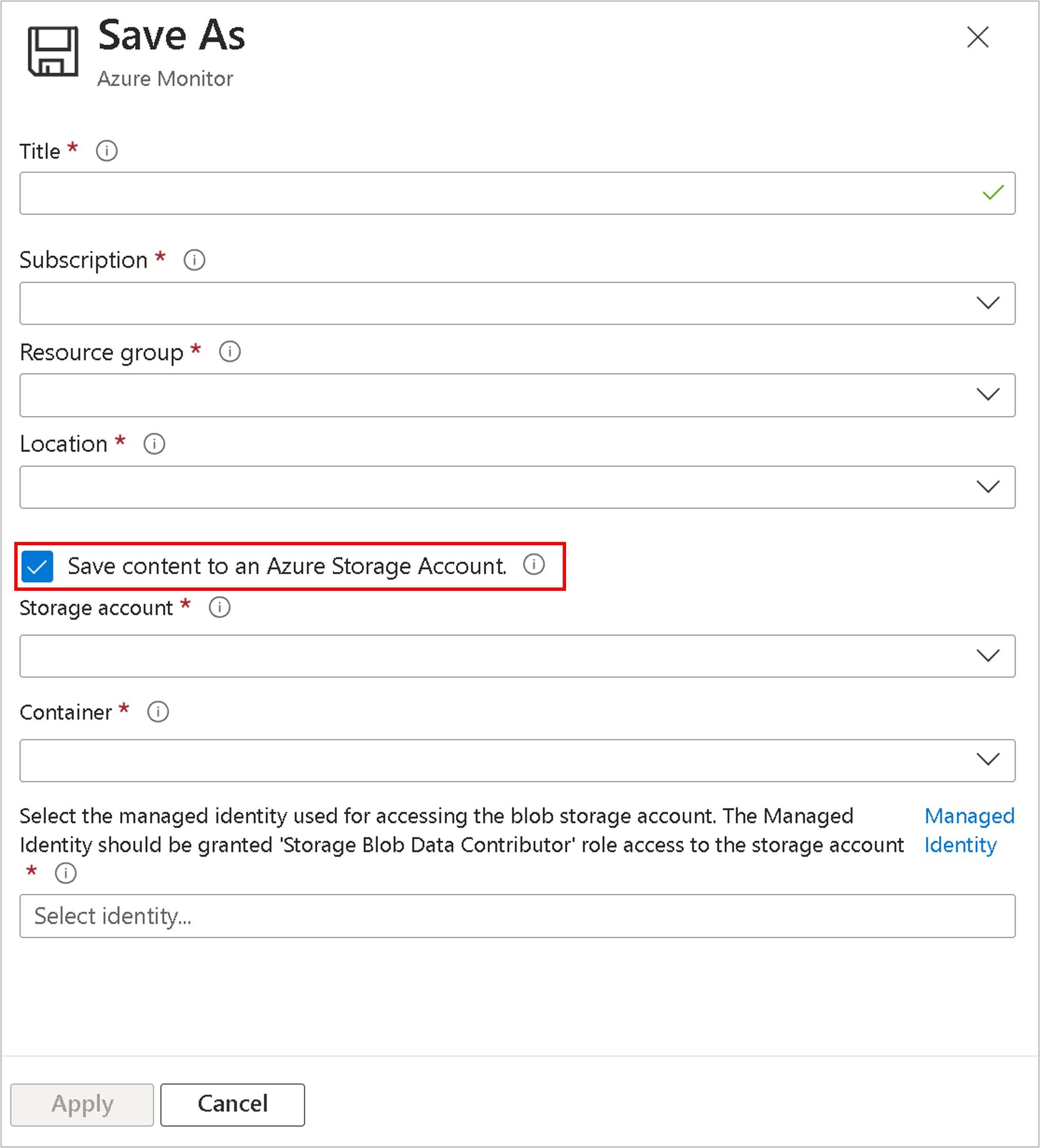 借助 Azure Monitor,还可以将使用密钥加密的工作簿查询存储在自己的存储帐户中。 请记住保存的查询和日志搜索警报的客户管理密钥中描述的相同注意事项。