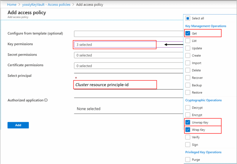 KeyVaultProperties群集,而 Key Vault 中缺少Get密钥访问策略,则操作会失败。如果无法部署群集,请验证 Azure Key Vault、群集和链接工作区是否位于同一区域。 它们可以位于不同的订阅中。