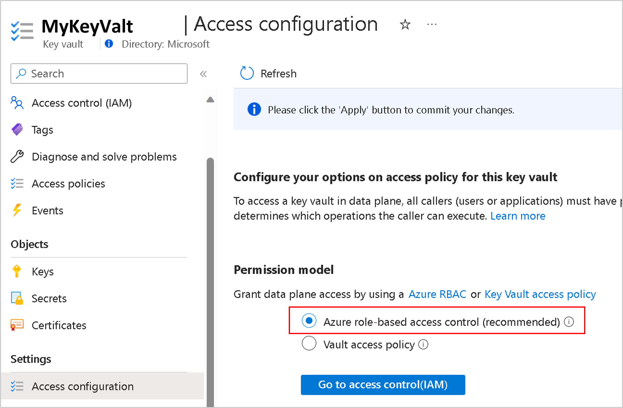 Microsoft.Authorization/roleAssignments/write和Microsoft.Authorization/roleAssignments/delete权限的角色,例如用户访问管理员或所有者。- 在 Azure 门户中打开 Key Vault,然后选择 “设置>访问配置>Azure 基于角色的访问控制 并 应用”。