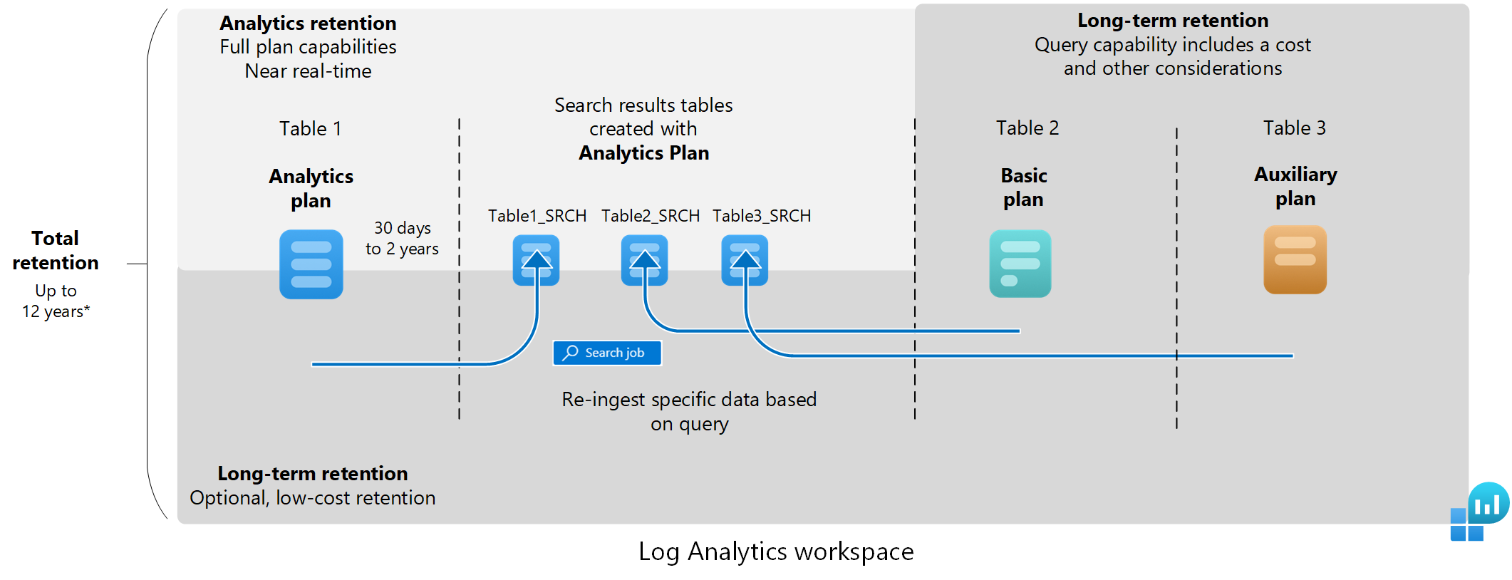 - 长期保留:在这种低成本状态下,数据不适用于表计划功能,但可以通过搜索作业进行访问。