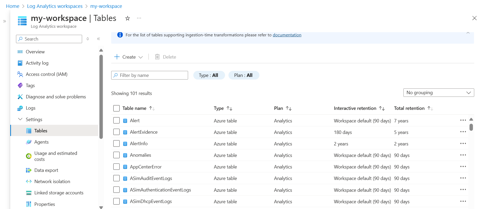 更改默认工作区级别的数据保留期设置会自动影响工作区中仍应用了默认设置的所有分析表。 如果已更改特定表的分析保留期,则更改工作区默认数据保留设置时,该表不会受到影响。