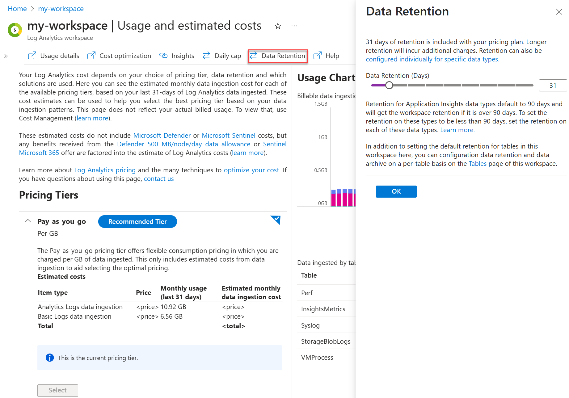 默认情况下,Usage 和 AzureActivity 表中的数据会免费保留至少 90 天。 如果将工作区保留期延长至 90 天以上,则也会延长这些表的保留期。 这些表格同样不会产生数据摄取费用。