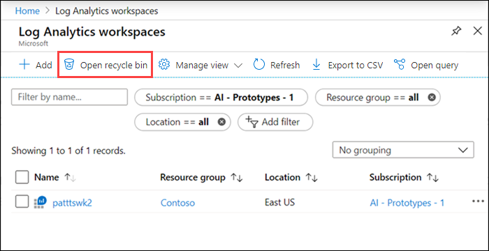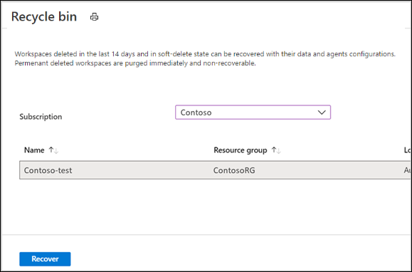 如果不确定已删除的工作区是否处于软删除状态并且可以恢复,请在 Azure 门户的“Log Analytics 工作区”页上选择打开回收站,以查看每个订阅的软删除工作区列表。 永久删除的工作区不会包括在该列表中。