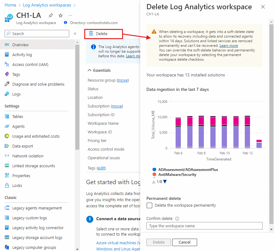 删除工作区时需谨慎,因为其中可能会含有对服务操作产生不利影响的重要数据和配置。 请了解那些将数据存储在 Log Analytics 中的代理、解决方案以及其他 Azure 服务,例如: