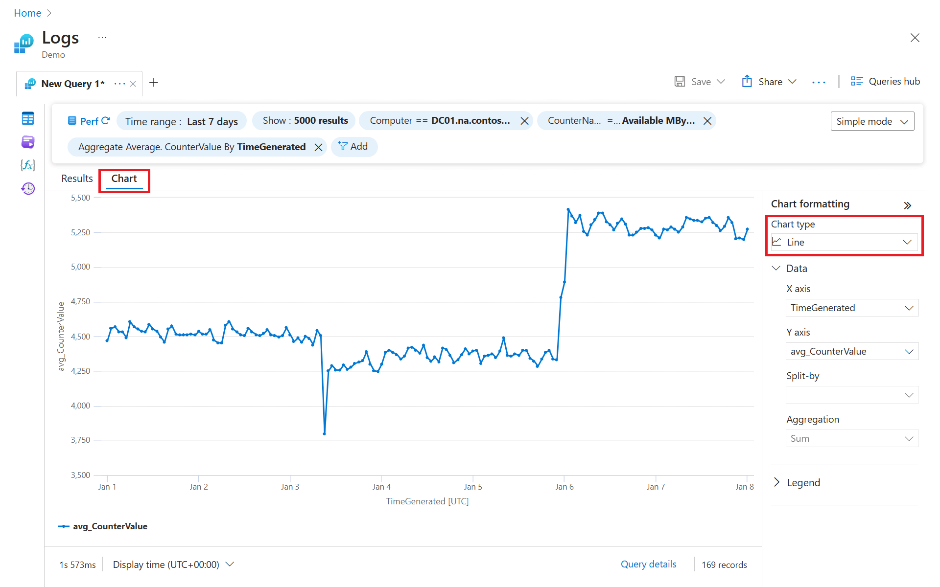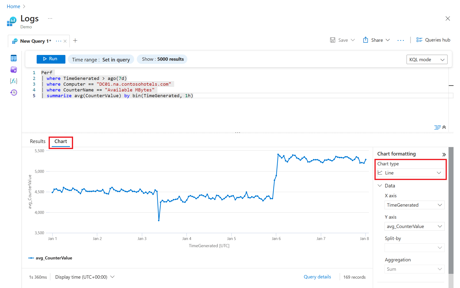 | summarize avg(CounterValue) by bin(TimeGenerated, 1h)