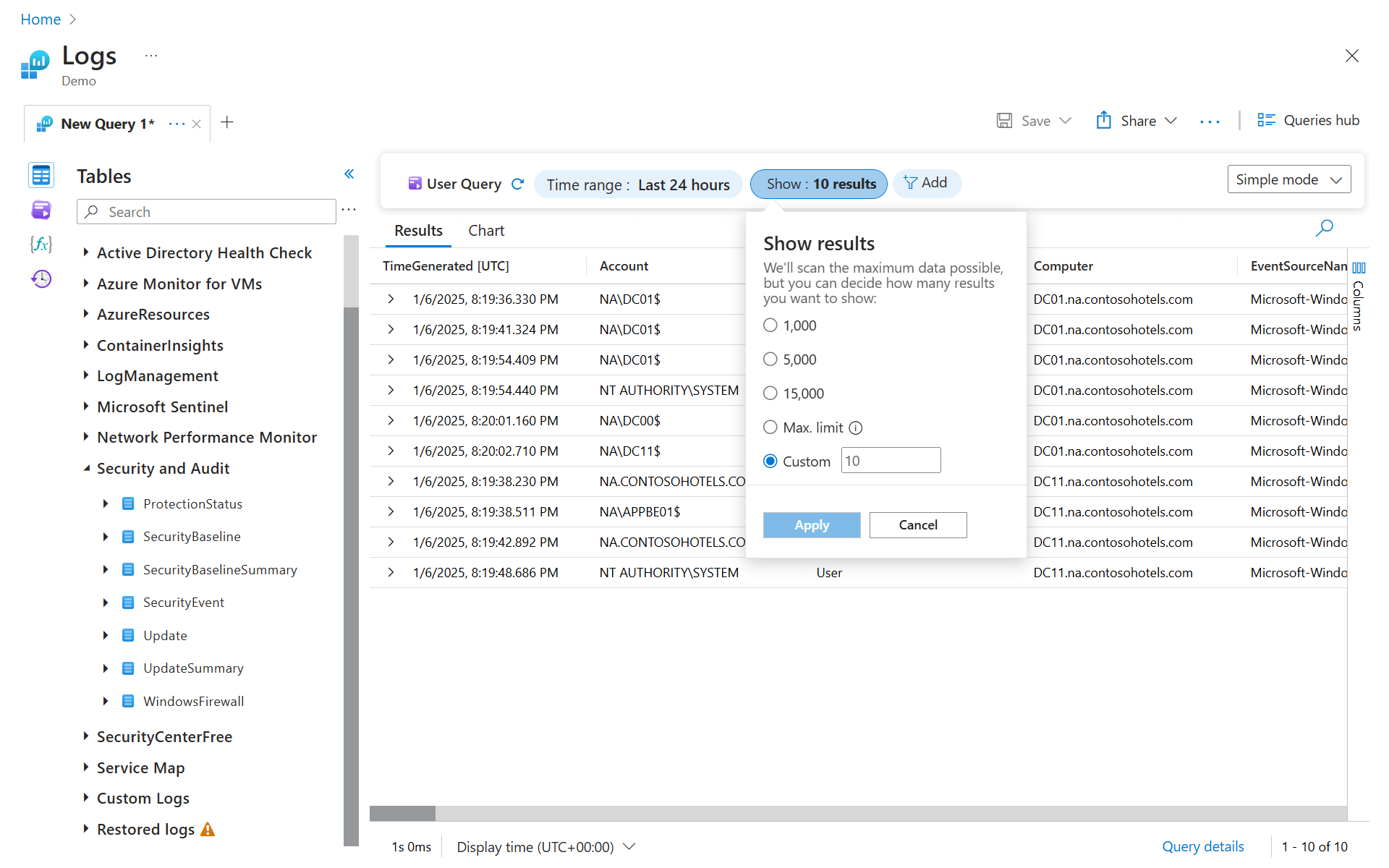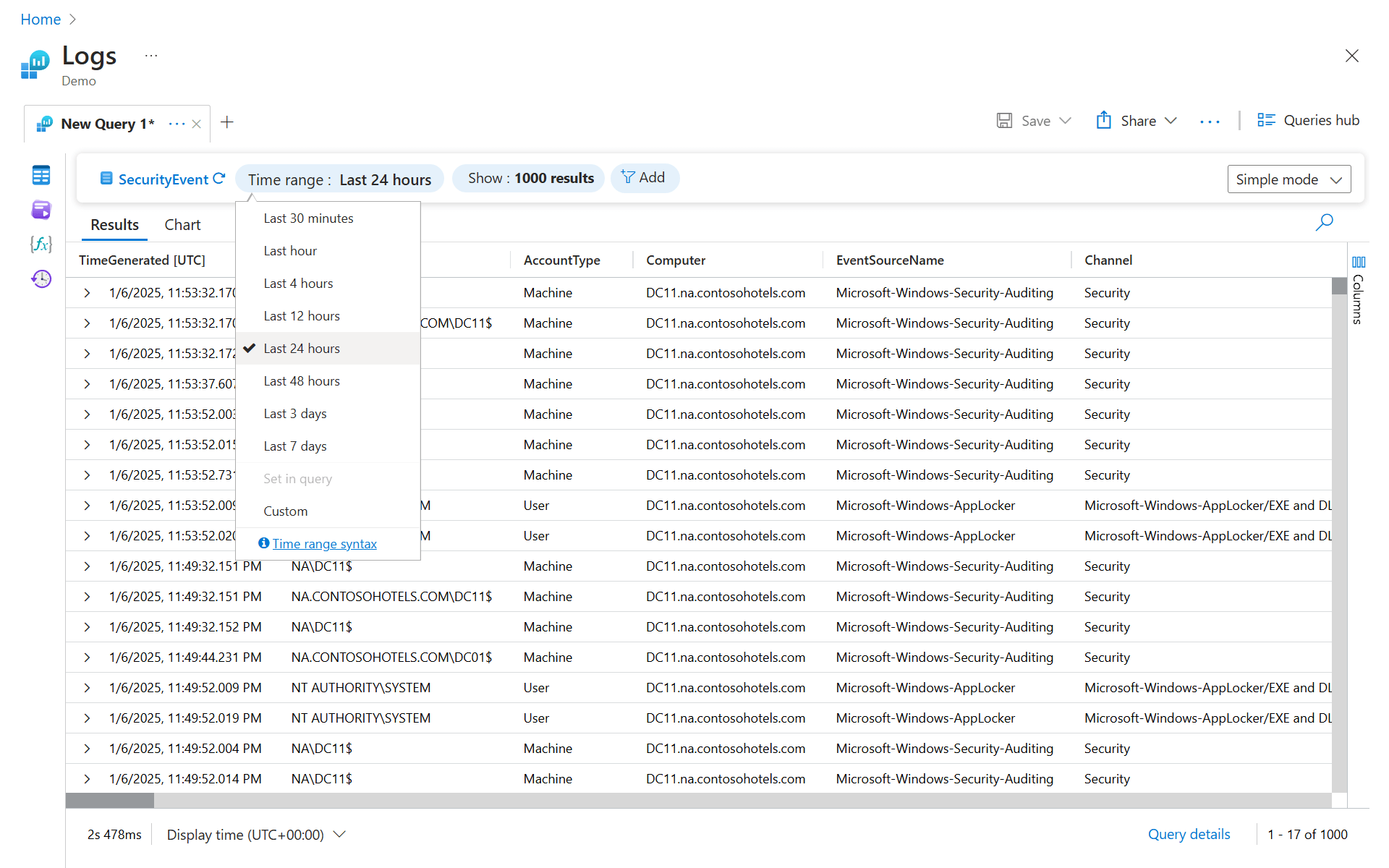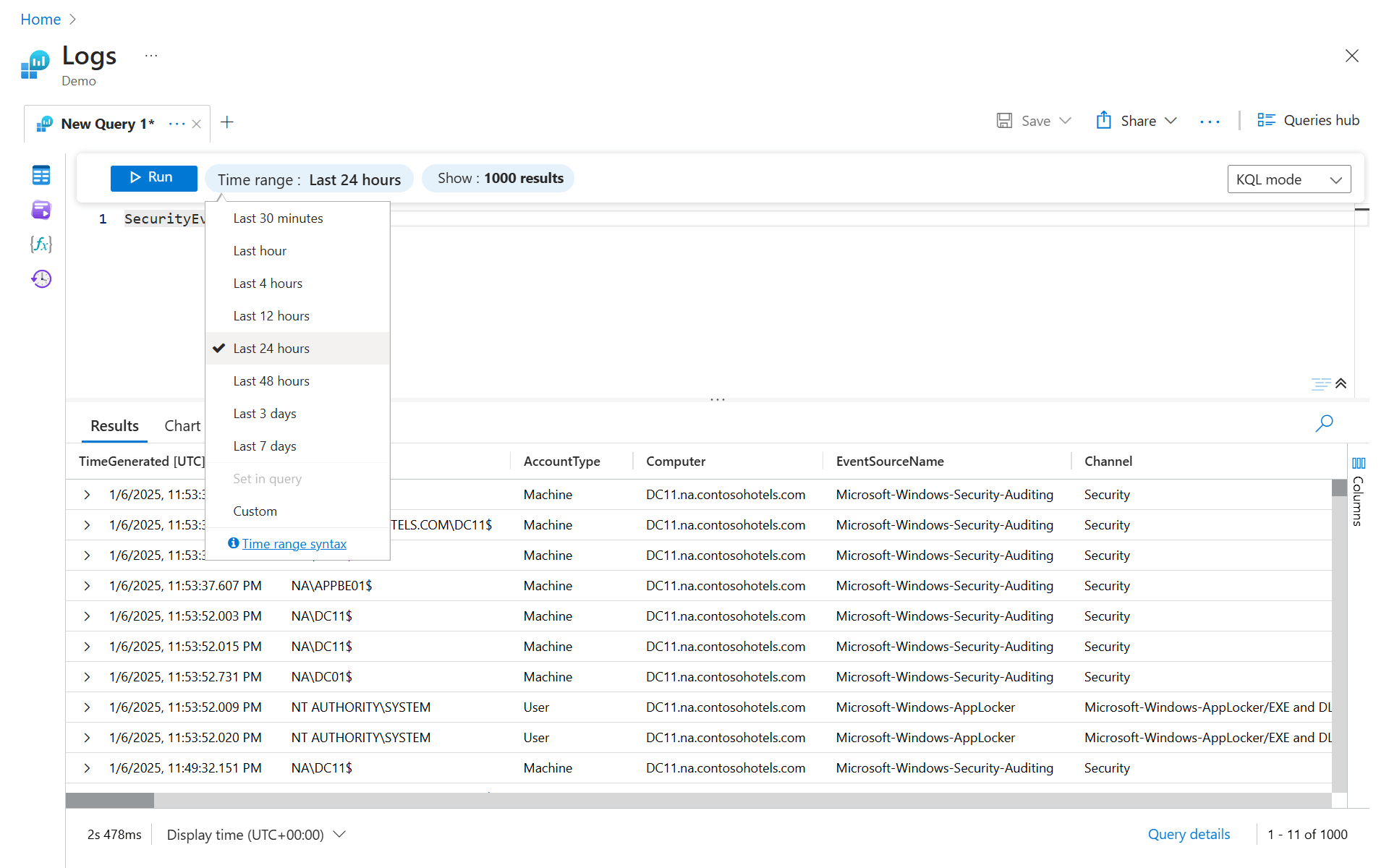 时间选取器显示在“运行”按钮的旁边,指示你只查询过去 24 小时的记录。 此默认时间范围应用于所有查询。 要获取仅过去一小时的记录,请选择“最后一小时”,然后重新运行查询。
