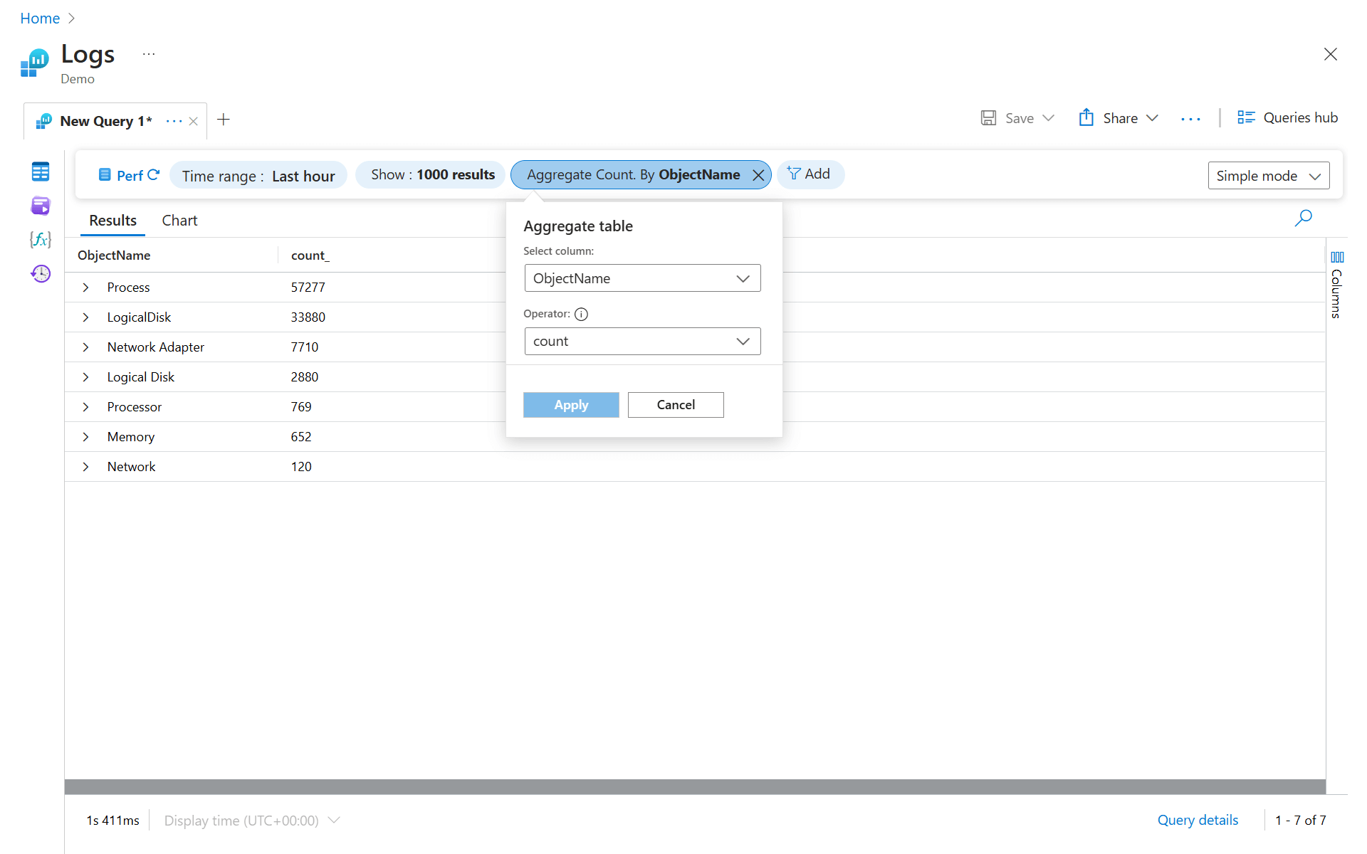 | summarize count() by ObjectName, CounterName