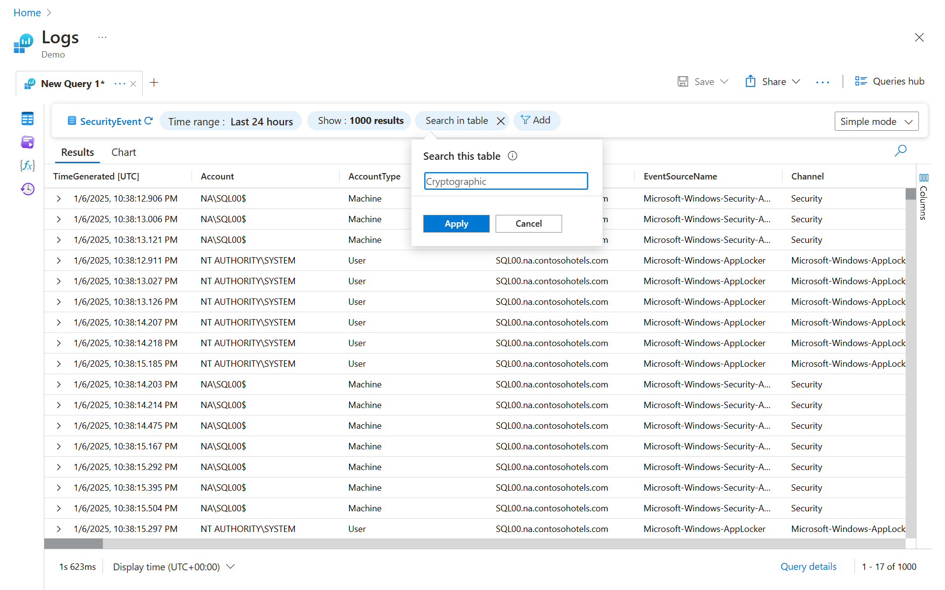 如果你省略in (SecurityEvent)部分并只运行search "Cryptographic",那么搜索将会遍历所有表。 此过程则会花费更长时间,而且效率更低。