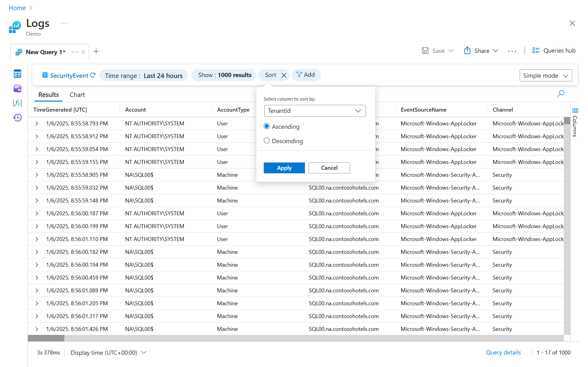 SecurityEvent | sort by TimeGenerated