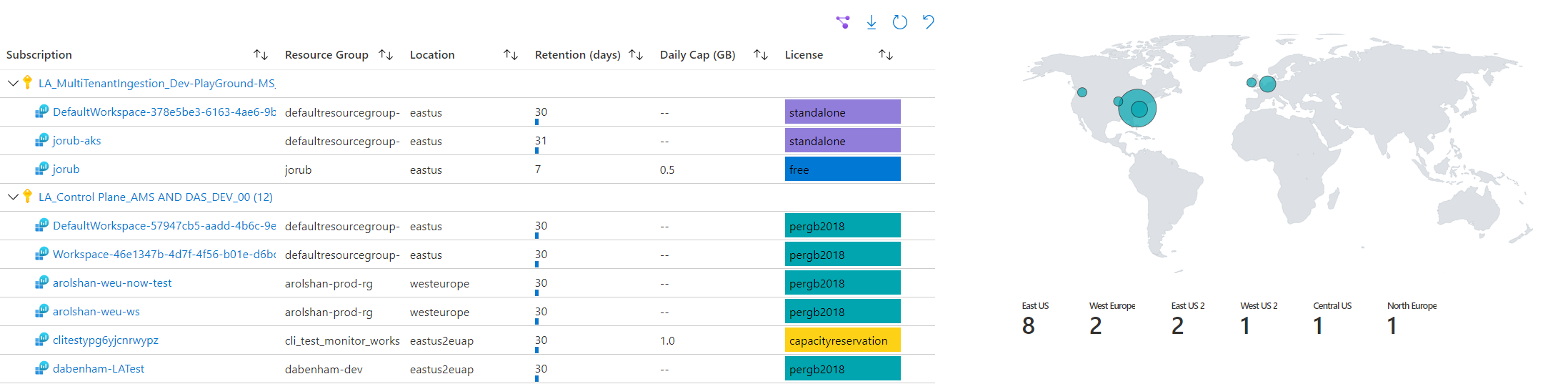 - 了解工作区在全球的分布情况。