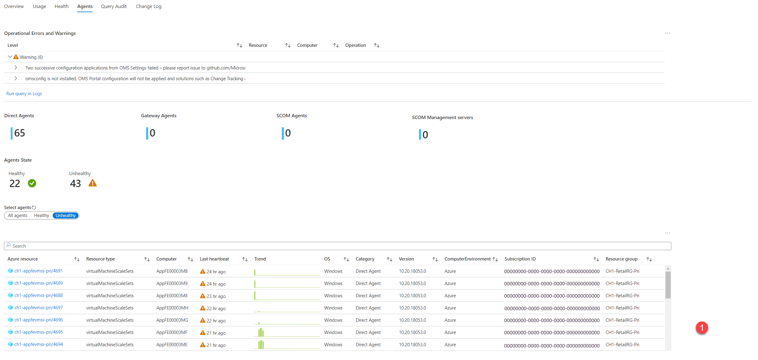 操作错误和警告:这些错误和警告专门与代理相关。 它们按错误/警告标题分组,以帮助你更清楚地了解可能发生的不同问题。 可以展开它们以显示所指的确切时间和资源。 可以选择“在日志中运行查询”,并通过日志体验来查询