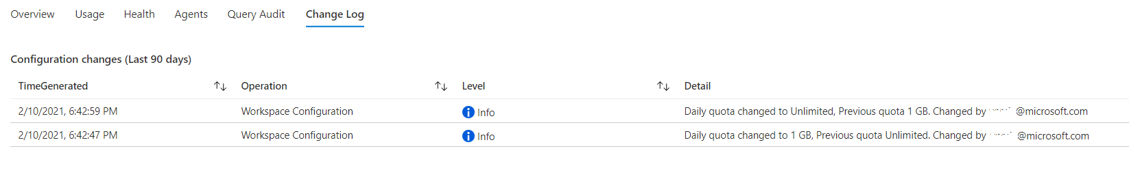 此选项卡显示过去 90 天内对工作区所做的配置更改(与所选时间范围无关)。 它还会显示是谁做了这些更改。 它旨在帮助你监视谁更改了重要工作区设置(例如数据上限或工作区许可证)。