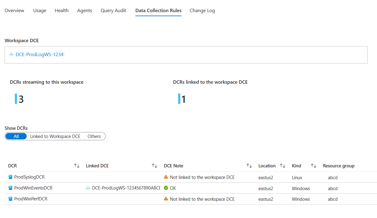 此选项卡显示工作区 DCE(如果已设置)和面向此工作区的所有 DCR。