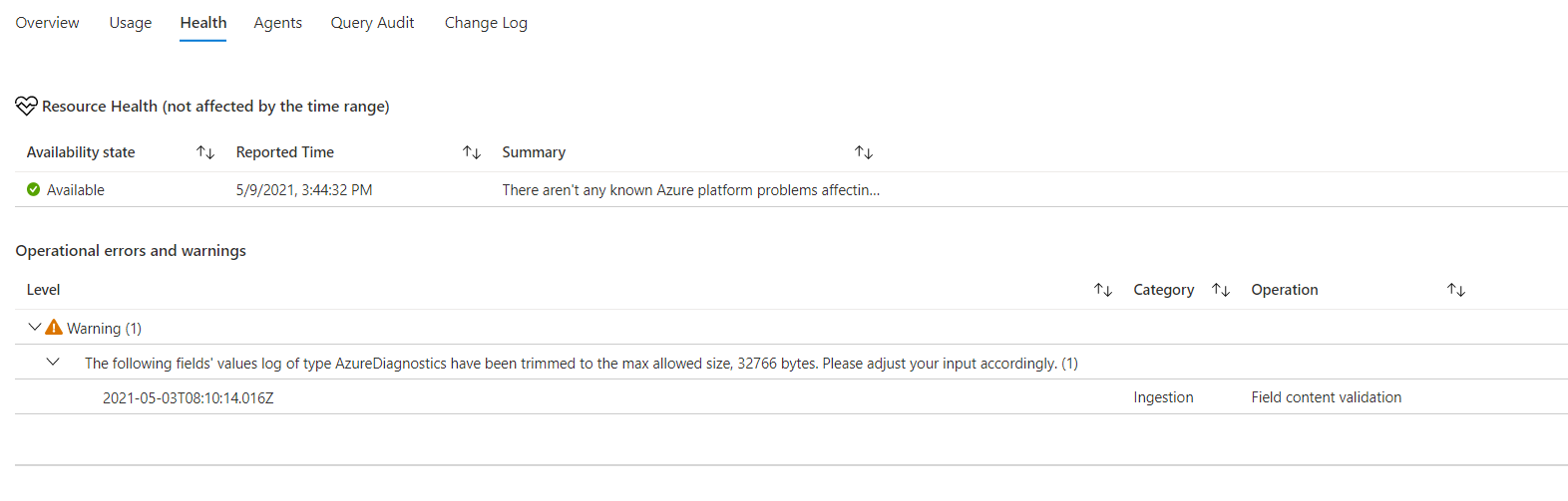 此选项卡显示工作区运行状况状态、该状态的上次报告时间,以及操作错误和警告(从 _LogOperation 表中检索)。 有关所列问题和缓解步骤的详细信息,请参阅在 Azure Monitor 中监视 Log Analytics 工作区的运行状况。