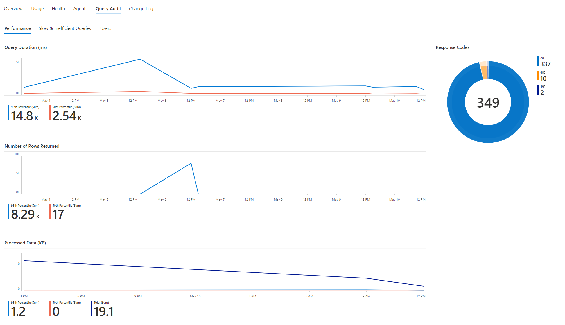 - 处理的数据量:一段时间内在所有请求中处理的第 95 百分位、第 50 百分位数据量和数据总量。