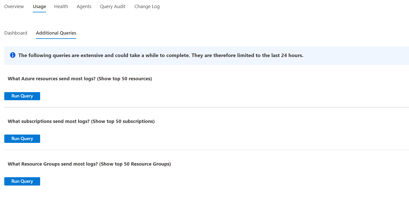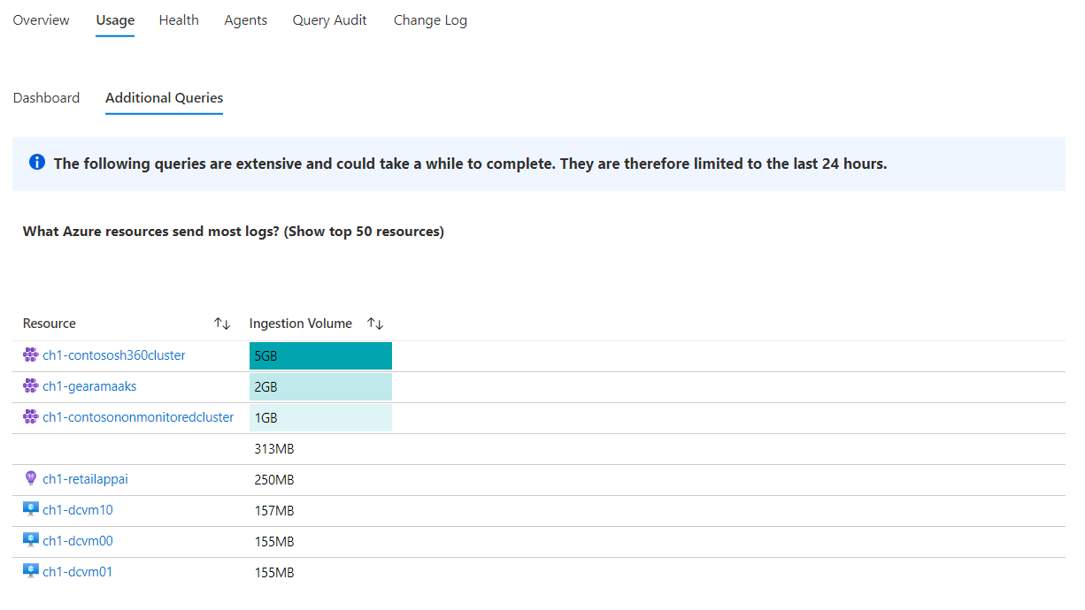 “其他查询”子选项卡公开跨所有工作区表运行的查询(而不是依赖于每小时刷新的使用情况元数据)。 由于这些查询更加广泛且效率低下,因此不会自动运行。 它们可以揭示哪些资源发送最多日志到工作区,以及这些信息可能如何影响计费。