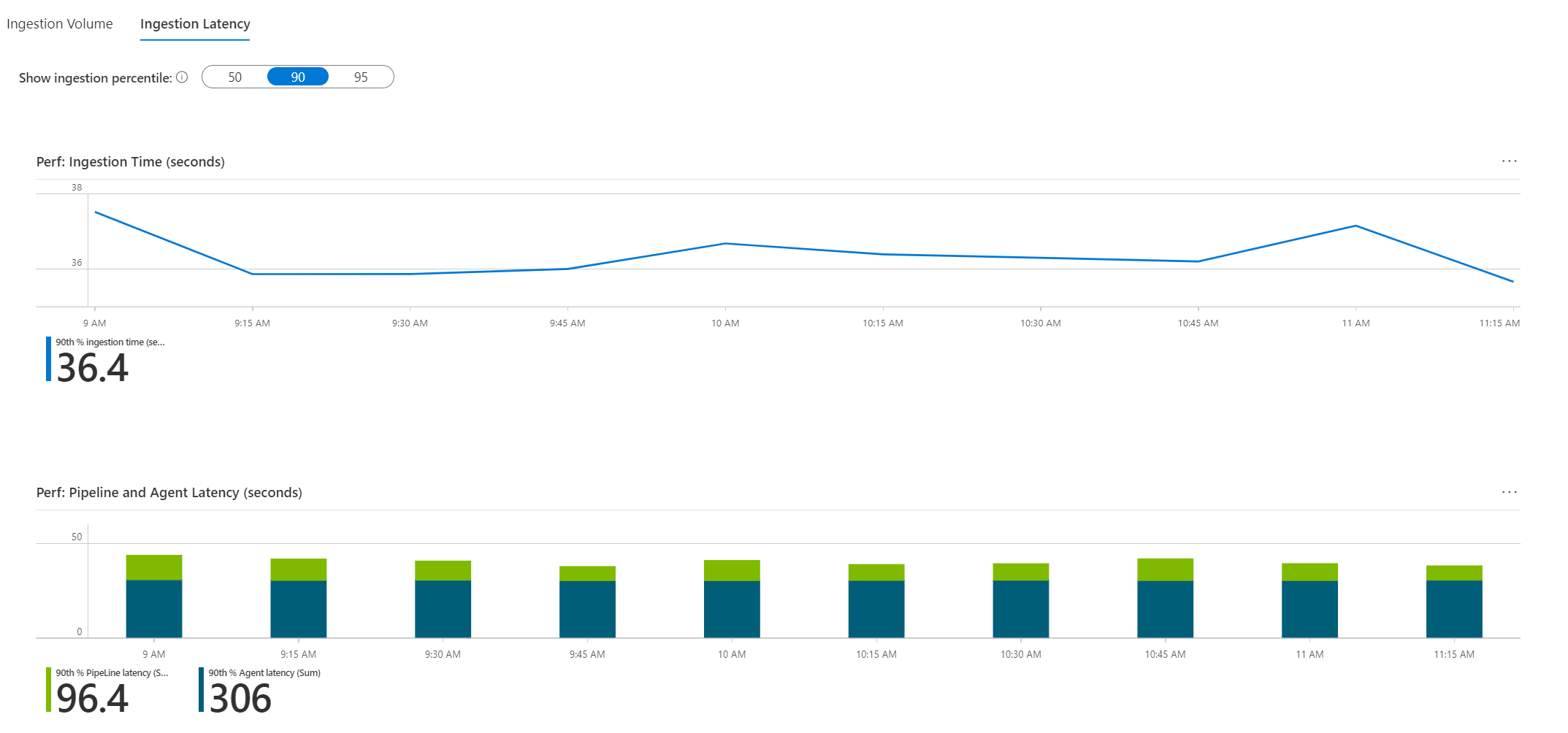 - 引入延迟:引入操作花费的时间,根据发送到此表的请求的第 50、90 或 95 百分位进行分析。 此区域的顶部图表描述了从头到尾针对选定百分位的请求的总引入时间。 它涵盖从事件发生时到被引入工作区的时间段。